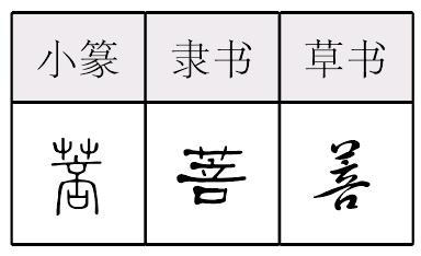 *菩pú11画 艹部 (1) 【菩提】 佛教名词,梵文Bodhi的音译。意译为正觉,指觉悟的境界。 (2) 【菩萨】 (—sà) 梵文Bodhi-sattva音译的省称。佛教指修行到了一定程度、地位仅次于佛的人。 另见bèi(16页)。 菩 ☚ 苦 茅 ☛ 菩pú《说文》小篆形声字。从草头,咅(pǒu)声。中古读bèi。韵变如咅倍陪培例。本是草名,苫(shàn)房子,山东曲阜市叫黄背草。中古又读pú。韵变如牟用于姓和山东牟平县时说mù,缪读móu又通穆,反之如露、都又说lòu、dōu例。用于菩萨。是印度古梵(fàn)语菩提萨堹(du)(Bodhi-sattva)的简称。意译是“觉有情”,即“上求菩提(觉悟),下化有情(众生)”的人。或译为“大士”。即“发大心的人”。是佛教中指地位仅次于佛的人。泛指佛和某些神。 菩★常◎常