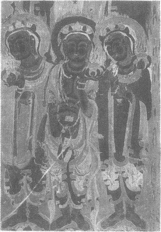 ☚ 孔雀图壁画 “大统四年”供养人图壁画 ☛ 菩萨图壁画 菩萨图壁画隋。纵150厘米,横90厘米。甘肃省敦煌县莫高窟第420窟西壁龛北侧壁画。这组菩萨共三身,皆呈站立状,体态丰满,面相甜美,表情含蓄。以黑色描绘肌肤,五官、双颊、双乳等高光处重色描绘。托摩尼宝珠和持念珠的手姿优美。背光、宝冠、项圈、手镯等装饰处均贴金,使画面增添了富丽的效果。
