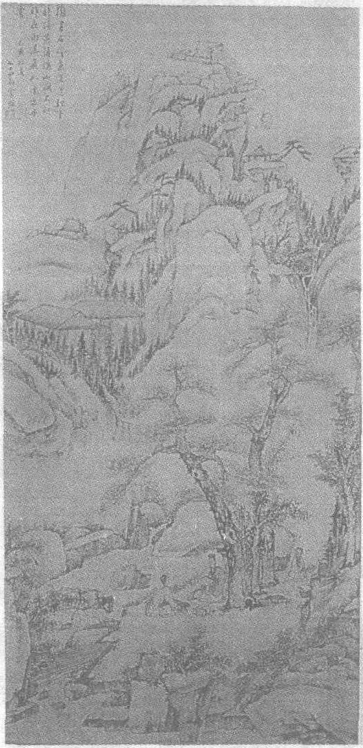 清。萧云从(见《萧云从闭门谢客图页》条目)绘。纸本。纵132厘米,横66厘米。北京荣宝斋藏。此图作者采用全景山水画法,峻厚的峰峦尽收眼底,雄伟壮美,具有淳厚的气质。山坳林木间建有房舍、凉亭,激荡的溪流折回蜿转,汇聚成一弯深潭,板桥横跨其上。潭旁一块平缓的坡地上,两位高士盘膝相坐于虬松之下,高谈阔论,其中一位手持文稿,两函古书置于身旁。稍远处一童子挥扇烧水,以备高士品茗。作者在描绘高山时,多使用他所创造的直线表现法,用各种竖线、斜线、横线使山体显得尤为稳重、冷峻,山石显得更为坚硬。配以隐逸的高士,整个画面具有恬静遥深的韵致。图中有自题七绝一首:“摊书石磴意逍遥,松下时听燕语娇,山间不知昨夜雨,瀑飞如练出丹霄。”署款“己酉初夏,七十四翁云从”。