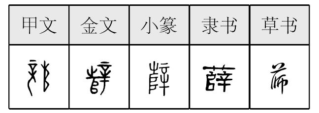 【提示】艹,3画,宋体是一横两竖,楷体第三笔竖改撇; 不要依旧字形写成四笔 ( )。 辛, 中间一横长,下面一横短,不要写成中间横短下横长。 *薛xuē16画 艹部 (1) 草名,即赖蒿,又名赖草。多年生草本植物。有固沙作用。 (2) 春秋时国名。 薛 ☚ 荑 苦 ☛ 薛xuē甲骨文从辛(象曲刀形,刑具),月声。古代声母为舌根鼻浊音。读niè,是孽的本字。蘖糵等同音。西周金文同形的用作薛国的薛(xuē,在今山东滕县),音变如薛本从(niè)声,又绥馁、需糯懦例。 甲骨文或从辛从𠂤(堆字的本字),金文和篆隶楷也从𠂤。 周代金文和篆隶楷𠂤上还从屮(chè,又同草)。 《说文》从𡶫(niè)声,孽蘖糵(都读niè)从它得声。周代金文同乂(yì或ài),治理义。 秦汉间以为国名。 小篆另有加草头的字,指赖蒿,读xuē。约汉代以后用它作国名,作薛。 薛★常◎常