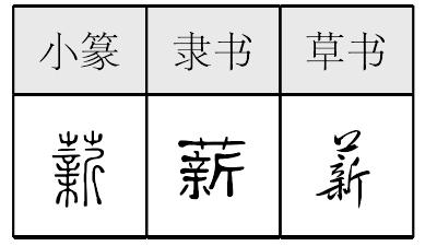 【提示】艹,3画,宋体是一横两竖,楷体第三笔竖改撇; 不要依旧字形写成四笔 ( )。 下左的 “亲”,第七笔是竖钩,第八笔宋体是撇,楷体是点。 *薪xīn16画 艹部 (1) 作燃料的木材: 杯水车~|釜(fǔ)底抽~。 (2) 薪水、薪金的省称: ~俸(fèng)|月~|年~|发~。 薪 ☚ 蕘 蒸 ☛ 薪xīn甲骨文金文象斧斗(“斤”)砍伐树木状,即薪的本字。小篆有薪字。从草头,从新,新亦声。指作燃料的木材。即柴火,劈(pǐ)柴。如:杯水车薪|有积薪之势(指后来在上)。组词如:薪水|薪金。指买柴火的钱,有生活费义。清代以后又简称薪。 薪★常◎常