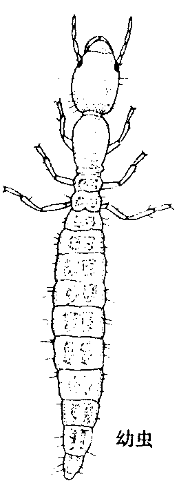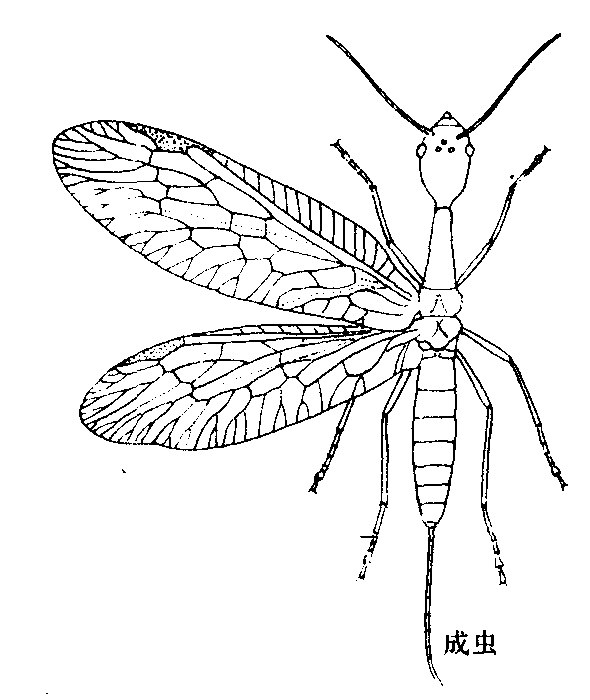 幼虫衣鱼型,暗灰、褐色等,体表光滑,前口式;眼由4~7个小眼组成。触角刚毛状,3或4节; 口器咀嚼式。腹部10节,无尾须。前胸气门1对,大形:腹部气门7对(见图)。 习性 成虫陆栖,肉食性,发生在森林地带中繁茂的草丛、花和树干等处捕食其他昆虫。雌虫产卵在植物的皮部裂缝中。幼虫多树栖,常在松柏科植物松散的树皮下生活。取食小蠹甲等小型昆虫。在蛹室内化蛹; 羽化前,离开蛹室,寻找适合的场所羽化。 蛇蛉目Rhaphidiodea昆虫纲,有翅亚纲。包括蛇蛉科和盲蛇蛉科。成虫体小至中型。头长,后方收缩呈三角形。单眼3个,盲蛇蛉无单眼。触角丝状;咀嚼式口器,前口式。前胸长颈状,两对翅相似,翅脉网状,有翅痣,休息时呈屋脊状。足跗节5节。雌虫有细长产卵器。全变态。卵产于树皮等物的裂缝内。幼虫树栖。幼虫与成虫均肉食性,捕食小蠹虫等小型昆虫,为森林益虫。本目已知约120种。西岳蛇蛉(Augulla xiyueYang et Chou)分布陕西华山。