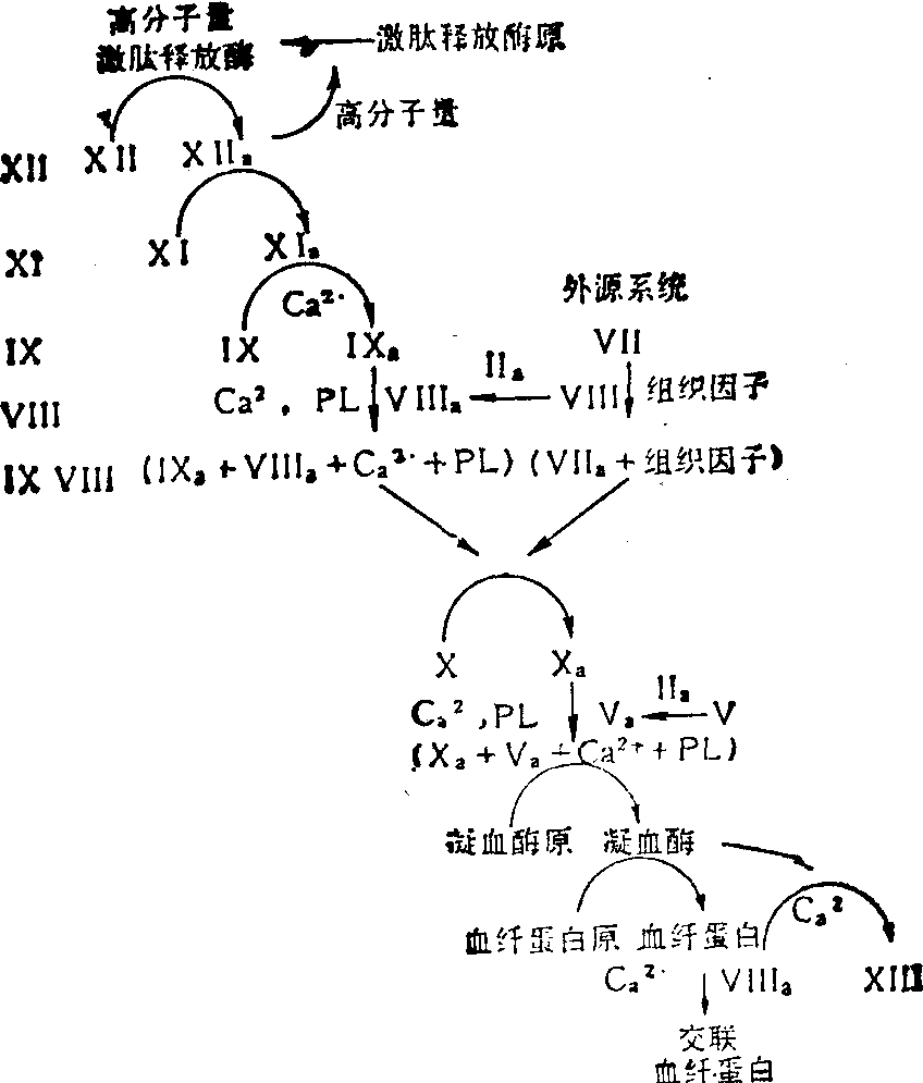血液中有一套凝血系统,它们都是蛋白水解酶,共有十几个。平常在血液中全部处于酶原的状态。在皮肤表面出现伤口时,有两个过程促使酶原相继激活,最后使凝血酶原激活成凝血酶。后者使血纤蛋白原转变成血纤蛋白而凝血。两种过程之一是内部机制。它是皮肤表面接触后,因子Ⅻ首先激活,整个肽链切成三段,一段有蛋白水解酶活力,它使因子Ⅺ的两条链上各切出一个缺口,于是被激活,它再激活因子Ⅷ。激活的因子Ⅷ又激活因子X,因子X激活后,就作用于凝血酶原。还有一种过程是外部机制。受伤的组织分泌促凝血酶原激酶。这个酶与因子Ⅶ一起,直接使因子X激活。因此这一过程是反应比较快的。凝血酶系的相继激活,可示意如图。