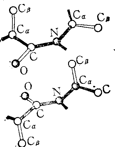 图3 两个相邻的酰胺平面围绕着Cα的旋转情况 酰胺平面两侧的Cα—N与C—Cα键是σ键,都是可以自由旋转的。这样,抓住两个相邻的酰胺平面,以共用的Cα为定点旋转,如图3所示。如不考虑侧链的影响,两个酰胺平面相互间可以有无数个位置。假如一条肽链上所有的酰胺平面都作这种旋转,肽链就会像一条柔软的链条,构成各种不同的立体结构。在这各种结构中,侧链之间可以是直接接触,也可以是相距甚远。因此酰胺平面间的相对旋转,造成了主链可以以非常多样的构象出现。酰胺平面相互旋转,使主链出现各种构象。主链构象不同,侧链R就出现在不同的空间位置上。侧链有大有小,相互间或者吸引,或者排斥,是有相互作用的。一个蛋白质因侧链的这种作用力,使得主链与侧链相互影响,相互制约,达到一最稳定的状态。为了适应侧链构象的要求,有时要破坏主链构象的安排,但侧链构象的形成又巩固了主链的构象。两者矛盾地统一,形成整个蛋白质分子的特定构象。 ☚ 蛋白质的一级结构 蛋白质主链构象的结构单元 ☛ |