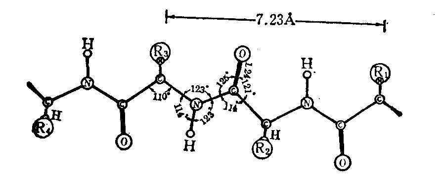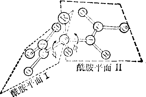 图1 全伸展的肽链中主链上的各种键长及键角的数值 在肽链中,残基间以肽键相联结。主链有关的键长与键角见图1。肽键从化学上看,是酰胺键。图1中的HN—CO间肽键的键长是1.32。但一般有机胺的C—N键长是1.49,异氰根(C=N)的键长是1.27。肽键键长在两者之间,因此肽键带有双键的性质,近似于π键,C—N间不能自由旋转,