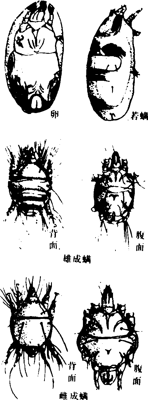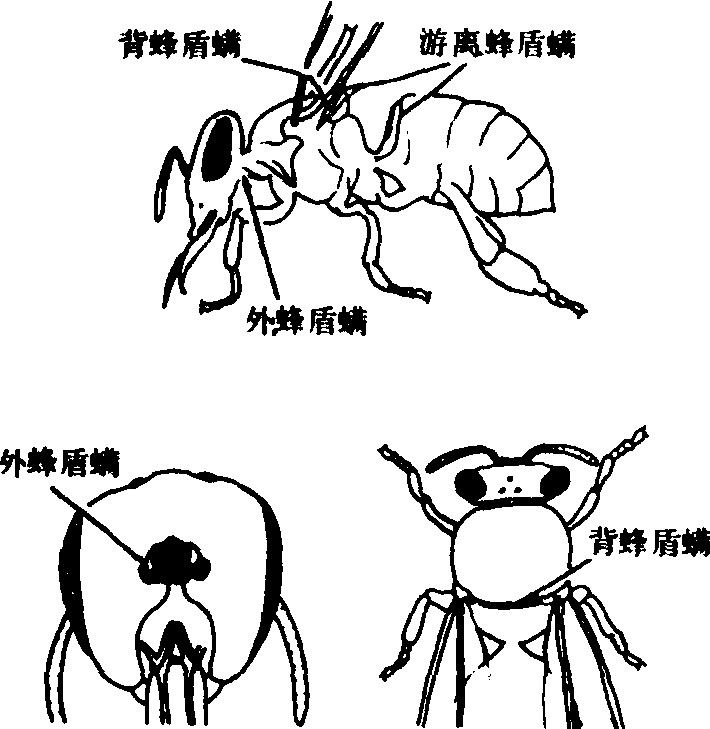 图1 武氏蜂盾螨的各期虫态 卵期为3~4天,最长5~6天。雌性若螨期为14~15天,雄性若螨期为十 一二天。从卵发育至成螨,雌体约需17~19天,雄体约14~16天。武氏蜂盾螨主要聚集寄生在蜜蜂的第1对气管基部产卵繁殖,1只患病蜜蜂气管里常可见100~150个各期虫态的螨。武氏蜂盾螨也可寄生在蜜蜂的体表和翅基部,尤其是在蜂群越冬期,螨常聚集在蜜蜂的翅基部产卵繁殖。受螨寄生的蜜蜂,由于翅基部的运动神经受损,常使蜜蜂前后翅错位,形成“K”字形,严重时还可使两翅脱落。 武氏蜂盾螨脱离活蜂体后的存活时间很短,受外界温湿度影响较大。附着在蜂尸上的武氏蜂盾螨,在相对湿度10%下,温度4℃时,可存活120~144小时;12~20℃时可存活30~35小时;50℃时可存活1.5小时。在相对湿度40%,温度30℃时,可存活三四个小时;40℃时可存活2小时。 对武氏蜂盾螨的防治,宜采取综合措施:❶注意蜂群检疫,发现病群,立即将病群迁至7000米以外的地方进行隔离治疗。 ❷组织新群,剔除病蜂。从患病群中将封盖子脾提出,进行分群羽化,同时诱入健康蜂王,以组织新的健康蜂群。 ❸药物防治,通常采用水杨酸甲酯、杀螨醇等药物和溴螨酯(Folbex)烟剂。 外蜂盾螨 学名Acarapi s externus Morgen-thaler。仅寄生于蜜蜂的颈腹部边缘和头膜的V形沟内。首先在瑞士发现,后来在英国也有发现。 背蜂盾螨 学名Acarapis dorsalis Morg.。主要寄生在蜜蜂的胸部背面,有时可延至小盾片处。它们的卵、卵壳和若螨的蜕皮,常沿着蜜蜂的体沟排列成行。 游离蜂盾螨 学名Acarapis vagans Morg.。无一定寄生部位,常寄生在蜜蜂的后翅基部附近,但也可以寄生在前翅、前足以及第1对腹节等处,而且可在整个蜂体上扩散。 上述几种蜂盾螨的寄生部位见图2。