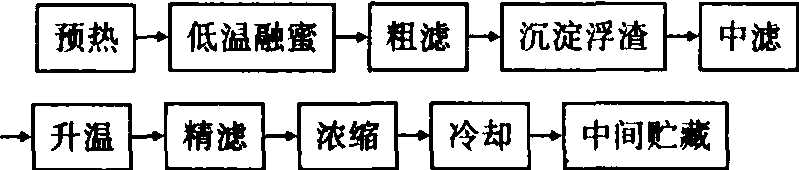 ❶预热。将结晶的蜂蜜置于60℃的水浴槽或预热室中融化; ❷低温融蜜。在水热或夹层锅里搅拌蜂蜜,使其均匀受热,蜜温控制在40℃左右; ❸过滤。先用泵加压粗滤,粗滤常用70目滤网,分离原蜜中蜡屑、死蜂等杂质。蜂蜜缓慢地从沉箱中经过,蜜温保持在38~43℃,30分钟后清除沉淀下来的较大重量的固体颗粒,以及泡沫和轻浮杂质。经过粗滤,须再用90目的滤网,进一步分离机械杂质和结晶颗粒,以防蜂蜡融入蜂蜜,这一过程称中滤。中滤时应禁止升高温度,采用加压密闭过滤,防止香气逸出。过滤的最后步骤是升温精滤,使粘稠度降低,进一步分离不溶物,通常用120目滤网。经过滤后的蜂蜜须快速冷却,恢复常温,以保护蜂蜜的有效成分; ❹减压浓缩。浓缩前使蜂蜜升温,以缩短蜂蜜进入蒸发器后的停留时间。减压浓缩是用真空泵降低压力,降低水的气化温度。温度为45~55℃。蜂蜜减压浓缩后会损失香气,因此只对蜂蜜含水量有特殊要求时采用。深色或异味的蜂蜜经浓缩后可脱色去味。 加工后的蜂蜜分别灌桶、灌瓶或袋装贮存。蜂蜜属弱酸性液体,与铝、锌、铁等金属容器接触会发生化学反应,宜用陶瓷、塑料等非金属容器装存。如用金属桶装蜜,应该使用内涂食品涂料的黑铁皮桶、合金铝或氧化铝桶。最好建专用的蜂蜜贮存池。蜂蜜贮存不当,吸水过多,会使耐糖性酵母菌大量繁殖,分解葡萄糖和果糖,形成酒精和二氧化碳。在有氧的情况下,酒精又分解为醋酸和水。发酵的蜂蜜会出现很多泡沫,产生酸味或其他异味,在35℃以上高温条件下更容易发酵变质。因此,包装蜂蜜宜放在干燥、清洁、通风、温度保持5~10℃、空气湿度不超过75%的仓库内。 现代临床医学认为蜂蜜对肝炎、心脏病、高血压、贫血、便秘、十二指肠溃疡以及褥疮性溃疡有一定的疗效。(见蜂疗) 蜂蜜是一种营养食品,其中大量葡萄糖直接进入血液被人体吸收,更大量的果糖是通过肠道后被人体所吸收。对老人、儿童、产妇以及病后体弱者尤为适宜。蜂蜜作为一种天然的致甜剂广泛应用于各种食品,凡是用蔗糖作配料的食品,都可部分或全部用蜂蜜代替。蜜制糕点有营养丰富、色泽鲜艳、味清香、甜而不腻、酥松软润、不易变质等特点。蜂蜜可加入各种饮料中,还可酿制多种蜜酒,在烟草加工及化妆品方面也被广泛应用。(见蜂蜜饮料、蜂蜜糕点、蜂蜜酒、乳酪型蜂蜜) 蜂蜜药名。出 《本草纲目》。又名白蜜、蜜糖。为蜜蜂科昆虫中华蜜蜂Apis cerana Fabrici-us或意大利蜜蜂A.mellifera L.所酿的蜜糖。全国大部分地区均产。甘,平。入肺、脾、大肠经。滋养,润燥,解毒。 蜂蜜honey蜜蜂采集植物花蜜或花外蜜腺分泌的甜汁,经反复酿制而成的甜物质。新鲜成熟的蜂蜜,是黏稠的、透明或半透明的胶状物质,密度1.401~1.433,pH4.5,呈弱酸性。不同蜜源植物的蜂蜜,有不同的色泽和独特的风味。有的蜂蜜容易结晶,晶体颗粒有的细腻,有的较粗。蜂蜜具吸湿性、旋光性,光线在蜂蜜中产生折射现象。蜂蜜含有180多种不同物质,果糖和葡萄糖占总成分的65%~80%,水分含量为18%~20%,还有不超过5%的蔗糖和其他少量多糖,此外,还含有多种游离氨基酸、矿物质、酶类、B族维生素为主的多种维生素和其他物质。高浓度的蜂蜜不易发酵变质,而不成熟的蜂蜜或结晶后上部的蜂蜜以及由于吸收空气中的水分而变稀的蜂蜜,其含水量都较高,容易发酵变质,特征是冒泡、变酸、有酒味。蜂蜜一般应贮藏在干燥、清洁、遮荫、通风和无异味的场所,盛装蜂蜜的容器宜用陶瓷、玻璃、无毒塑料或内涂防酸涂料的金属等材料,不能使用镀锌铁皮等金属容器,以防重金属污染。蜂蜜营养丰富,易被人体消化吸收,自古以来民间就有直接食用的习惯,是老人、儿童、运动员、重体力劳动者和病弱者的理想食品;可作为食品加工业中的甜味剂,食品中凡使用食糖的配方,均可用蜂蜜代替,如罐头、蜜饯、饮料、蜂蜜酒等;中药药丸、糖浆药剂也使用蜂蜜。 蜂蜜蜜蜂采集植物花蜜酿制而成的甜物质。黏稠胶状液体,密度1.401~1.443g/cm3,pH4.5。蜂蜜含180余种物质:含水量为16%~20%,含葡萄糖和果糖60%~80%,蔗糖及其他糖类低于5%,还有氨基酸、酵素、维生素等。 蜂蜜 蜂蜜工蜂将从花丛中吸吮的花蜜,回蜂巢后,即刻吐出分配给其它工蜂,再经众多工蜂多次“反刍”,经化学变化,全部花蜜在酶的作用下,彻底被水解为果糖和葡萄糖,工蜂将口器上形成的小液滴蒸发一部分,压入空蜂房中,经数日风干后,即变成粘稠的蜂蜜。蜂蜜中除含有大量的果糖和葡萄糖外,还有少量蛋白质、有机酸、维生素、矿物质和芳香物质等。蜂蜜的颜色、气味和成分因蜜源不同差异较大。蜂蜜的营养价值很高,也可入药,对咳嗽、便秘有一定疗效。老年人每日饮1~2杯“老年用蜂蜜”水,不仅健胃、助消化,而且还能增强肝的解毒能力,对患有肝病的老年人尤为有益,但对患有糖尿病的老年人要少饮。 ☚ 羊乳 蜂王精 ☛ 蜂蜜 蜂蜜性味甘平,以稠如凝脂、味甜纯正,清洁无杂质,不发酵者为佳。含有糖类(果糖、葡萄糖、蔗糖、麦芽糖)、氮化合物(蛋白质、氨基酸、过氧化氢酶、转化酶、淀粉酶、乙酰胆碱等)、有机酸、多种维生素、矿物质及微量元素等,为高级营养滋补品,具有补中、润燥、清热、解毒、止痛之功。老年人津液不足,大便燥结,肺虚津亏,口干燥咳、脾胃虚弱、神倦食少,心腹作痛可选用。炼制
