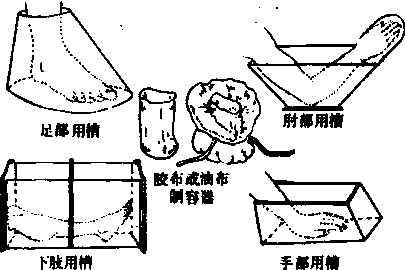 浸蜡法应用的容器 蜡袋法 先以0.3~0.5毫米厚度的透明聚乙烯薄膜或其他耐热塑料压制成大小不同的口袋,装入占塑料袋容积1/3的融化蜂蜡,排出空气后封口。治疗时将蜡袋放入热水中使蜡吸热到70℃融化,取出用毛巾包裹置治疗部位。此法操作简便,清洁,不浪费蜂蜡,便于患者携带回家治疗,但不能发挥蜂蜡的润泽和机械压迫作用。 蜡布法 将浸蜡纱布垫冷却到皮肤能耐受的温度,敷于治疗部位,然后再用较小的浸有65℃热蜂蜡的纱布垫放置第一层蜡纱布垫上,用油布或胶布盖好,再用床单、棉被或毛毯包好保温。中国采用热蜡帛治病的记载见《刘禹锡传信方》。 喷蜡法 蜂蜡加热100℃,经15分钟消毒后,冷却至70~80℃倒入经过消毒的喷孔直径为2~3毫米的喷射器中,将蜡喷在已清除痂皮、脓汁或分泌物的创面及周围2~3厘米的皮肤上。然后用热蜂蜡纱布或蜡饼敷上,再用胶布、床单、毛毯或棉被等裹好保温。治疗时间为30~60分钟,也可持续两三天。此法多用于长期不易愈合的溃疡和灼伤创面上。由于蜂蜡冷却时能堵塞喷射孔,因而在喷射器上应有控温加热装置,防止治疗中堵塞喷射孔。 蜂蜡绷带法 蜂蜡加热100℃,经15分钟消毒后,冷却至65~70℃,再用消毒的毛刷将蜂蜡滴在已清除痂皮、脓汁等分泌物的创面上。然后敷盖胶布(或蜡纸)和棉垫,最后用绷带固定。经24~48小时后,解开绷带,除去蜂蜡,再敷新的蜂蜡绷带。此法适用于治疗慢性创伤或久未愈合的营养性溃疡,对急性扭伤、挫伤亦有较好效果。 浇蜡法 蜂蜡加热到100℃,经15分钟消毒后,冷却到65~70℃,用汤匙或消毒纱布(棉花)将蜂蜡滴在已清除脓汁、痂皮或分泌物的创面上,厚度为1.5~2.0厘米。创面周围用棉花围紧。或将消毒过的蜂蜡冷却到较低的温度,在创面上形成一保护层,上敷一层棉花,再倾倒融化的蜂蜡于其上,使厚度达1.5~2.0厘米。最后用胶布或油布盖严,包以床单、棉被或毛毯保温。治疗时间为30~60分钟,也可持续两三天。此法历史悠久,晋葛洪《葛氏方》载:“治犬咬疮发,以蜡炙融灌入疮中。”北齐西郡王徐之才《徐王方》称:“蛇毒螫伤,以竹筒合疮上,融蜡灌之。” 头部蜡疗法 将蜂蜡加热到100℃后,冷却到65℃,用棉球浸蜡涂在面部,但须露出鼻孔、眼、口部。在蜡面具上,可放浸蜡纱布或蜡饼。对皮肤干燥者,在涂蜡之前应先涂以油类或含水羊毛脂;对皮脂分泌亢进者,可先擦香水或酒精。此法多用于治疗血管神经性头痛、面部皮肤瘢痕挛缩或神经麻痹。《经史证类备急本草》引述,《经验方》有用热蜂蜡1千克、盐250克相合,治头风掣痛的记载。 眼科蜡疗法 在眼睑皮肤上,用软毛刷涂数层融化将凝的蜂蜡,冷却成保护层以后,于其上部覆以浸蜡纱布垫,然后覆盖胶布和厚层棉花,周围用棉花围严,最后用绷带固定。治疗温度从55℃开始,以后增加到65~70℃。治疗时间从30分钟逐渐增加到1小时,每日治疗1次,25~30次为一疗程。 妇科蜡疗法 蜂蜡加热到100℃,经15分钟消毒后,冷却至60~65℃待用。治疗时,用阴道镜扩张阴道,清拭干净。然后用两三个经过灭菌的带线脱脂棉球,浸沾蜂蜡放入阴道中(100~150克蜂蜡)。用棉被或毛毯盖好保温。治疗结束后,用线拉出蜡栓,不必冲洗。或用阴道镜扩张阴道,以特制柔软刷浸热蜡在阴道壁上涂几层薄蜡,然后将浸热蜡的纱布塞于其中,或用大注射器将蜡注入阴道中。阴道蜂蜡栓塞可以单独应用,亦可与下腹部和短裤区蜡敷合用。治疗时间通常为1小时,亦可达到6~7小时。隔日治疗1次,10~15次为一个疗程。此法在月经期和月经前后两三天内禁用。 黄蜡灸法 作为针灸医术中的一种灸法,见《医宗金鉴》记载。先以湿面粉沿着病区围成一圈,高约3厘米,圈外围布数重。圈内铺蜡屑1厘米厚,随后以铜勺盛炭火在蜡上烘烤,使受热融化。蜡凉凝结后,再添蜡屑烘灸,以添至围圈满为度。并认为“皮不痛者毒浅,灸至知痛为止;皮痛者毒深,灸至不知痛为度”。灸完喷冷水少许于蜡上,候冷起蜡。适用于痈疽、疔疮外症和关节酸痛等。 蜂胶蜡疗法 天然蜂胶中分离得蜡质,在色泽、香味和活性成分诸方面均优于一般蜂蜡。因此,使用从蜂胶中分离的蜂蜡进行蜡疗更理想。如用普通蜂蜡,亦可在其中加入10%蜂胶以强化蜡疗效果,操作方法随选。中国古代已有加松胶强化蜡疗效果的经验,隋唐时代杰出的医药学家孙思邈撰著的《千金翼方》载:“疗伐指疼痛,以蜡、松胶相和,火炙笼伐指即瘥。” 蜡疗的注意事项: ❶不可将融蜡锅直接置炉火上加热,否则会影响蜂蜡的可塑性与粘滞性,甚至燃烧引起火灾。蜂蜡隔水加热时,应注意避免水浴锅中的水或锅内蒸汽所凝结的水滴滴入蜡中。由于水的导热性比蜡大,用同样温度的水和蜂蜡同时作用于皮肤时,就会因水滴而引起烫伤。以隔着管道蒸汽融蜡为宜。 ❷蜡疗时应涂抹均匀,动作迅速,准确掌握蜂蜡温度。使用蜡饼时,不能用力挤压,否则蜡液流出易发生灼伤并污染衣被。若采用浸蜡法,事先须告诉患者,每次浸入蜡液时均不超过第一层蜡膜的边缘,以免灼伤。给儿童蜡疗时应特别小心,因皮肤细嫩,又不易合作,蜡温应稍低于成年人。 ❸蜡疗时若患者有疼痛感,应立即检查处理。在治疗过程中,必须注意观察和询问患部皮肤情况,如发现有皮疹,应即停止治疗,查明原因,加以纠正(最常见的原因是蜡内杂质或添加物,蜡温过高,患者对油布或塑料布过敏等)。 ❹蜂蜡重复使用的次