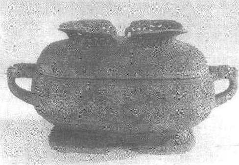 春秋。通高16.5厘米,口长23.5厘米,宽18.2厘米。1959年安徽省屯溪出土。北京中国历史博物馆藏。盨为古代食器,用来盛黍、稷、稻、粱等。出现于西周中期,到春秋后期便消逝了。此盨呈椭圆形,兽首双耳,有盖,盖顶呈对称的四瓣花状,盖可倒置为盘。矮圈足,四边中间各有一凹孔。通体饰细密繁缛的蟠螭纹。此器为春秋时期之物,造型端庄,纹饰为所见盨中最精美者。