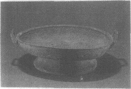 春秋。直径35厘米。1953年河南省郏县太僕乡出土。河南省博物馆藏。此盘折沿,双附耳,低圈足。腹外部花纹不甚清楚,似为夔纹。器内底为蟠龙纹,甚精细。盘周围为14条鱼纹构成一道阴线鱼纹带,简洁生动。今河南郏县在春秋初年属郑国,此盘当属郑器。