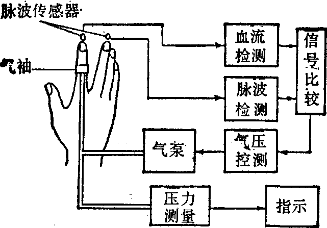 图1 典型的血压波形 血压是最常测量的生理参数。早在1728年,Hales Ste-phen(英)就采用将开口管子插入股动脉的方法,测量了非麻醉状态下马的血压。1861年,Chanven最早使用导管术测量了马的主动脉、左心室、右心室和右心房血压。1905年,Korotkoff(俄)首次报道了利用气袖式脉压计(Sphygmomanometer)间接测量人体收缩压和舒张压的方法,这是临床上至今仍最常用的标准的测量血压方法。二十世纪四十年代以来,随着电子技术的发展,一方面出现了多种自动血压计,广泛用于血压的无损伤检查;另一方面,导管式血压测量技术有了很大进步,并出现了导管尖端式血压计和可植入式血压计。 血压的测量方法分为直接式和间接式两大类。直接法能较精确地测量血压的动态变化波形,获得较多的血压数据,并能测量中心静脉压等低血压。该法对人体有损伤,主要用于心血管手术和重病人的监护及生理学实验等场合。间接法一般能断续测量动脉收缩压和舒张压,对人体无损伤,应用广泛。该法一般不能测量血压的动态变化及低的血压。间接法与直接法所测得的相应血压值相比,一般收缩压偏低,而舒张压偏高,差值在1,330Pa(10mmHg)以下;直接法的测量值更接近真实的血压值。 间接式血压测量 其测量系统置于体外,经皮肤和组织与血液耦合,间接测量血压。实用的测量系统有三个基本组成部分,即缠于肢体适当部位的气袖(Cuff)及其充气系统、动脉血液状态识别系统、血压测量及显示系统。气袖经组织耦合,对血管壁施加外压,其宽度以被缠部位肢体周长的百分之四十左右为宜,松紧应适中。充气系统为气袖充、放气。动脉血流状态识别系统用以确定气袖远心侧动脉血流的状态,进而控制血压数据的测量。当血流由阻断变为刚出现脉动流时,测量气袖内当时的气压,作为收缩压;当血流由断续脉动流形式变为连续脉动流形式时,测量气袖内的气压,作为舒张压。血压的测量及显示系统一般由测压装置和显示器组成,能给出收缩压、舒张压及平均压等血压数据。血压测量时,应保持气袖在与心脏相同的高度上。 间接式血压测量的传统方法是气袖式脉压计法,其测量系统由水银压力计或弹簧式气压表、充气袖袋(脉压袋)、听诊器及打气皮囊等部分组成。其中,压力计为血压的测量和指示装置;听诊器用以监听血管振动音(柯氏音),由此识别血流状态。这种方法广泛用作临床的常规血压检查方法,并常常作为校准其他血压计的标准,简便易行;其缺点是存在人为误差,不能连续测量,不能适合病人监护的要求。 间接式血压测量的自动方法是采用各种自动血压计。这种血压计能自动地定时测量血压数据,适用于临床监护和体格检查等场合,它按识别血液状态的方式不同,分为柯氏音式、脉波式、超声波式和相位差式等多种。 (1)柯氏音式自动血压计: 其基本工作原理如图2所示,由微音器检测血管振动音,自动识别柯式音,进而确定收缩压和舒张压。气压控制系统和气泵使气袖按一定速率自动充、放气。按需要和预置的程序,系统可自动定时工作,断续测定血压数据。这种血压计受环境噪音干扰较大,舒张压的测量精度较低。(2)脉波式自动血压计: 其特点是根据气囊远心侧动脉脉波的状态识别被测部位的血流状态。一种手指端脉波式自动血压计的工作原理如图3所示。当缠以气囊的指端脉波传感器无信号输出,而未加气囊的指端脉波传感器有信号输出时,表示气囊远心侧血流阻断,于是气囊自动减压;当二脉波传感器均有输出时,表示血流导通,于是气囊自动增压。这样,气囊内的气压便自动跟踪动脉收缩压。这种血压计能连续测量动脉收缩压,且因脉波传感器和气囊可置于指端等末梢部位,对病人扰动较小,较适合于长时间监测; 但不能测量舒张压,也不适合于脉波微弱的情况。