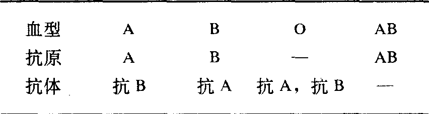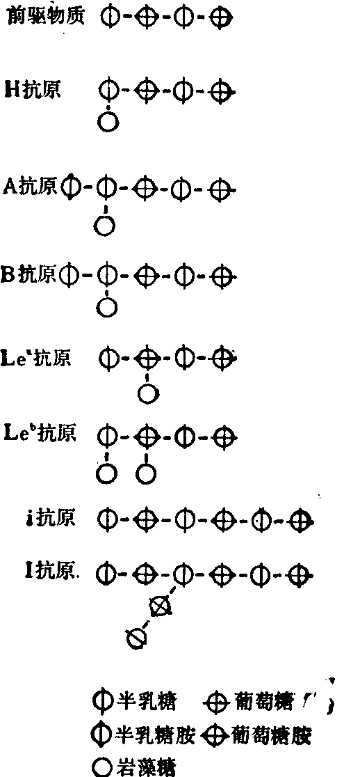 ABH,Lewis及Ii系统特异抗原决定簇示意图 目前尚未发现血型抗原特异性与红细胞的主要生理功能有何重要关系,前者可能是作为红细胞(或各组织细胞)的标志,以利于吞噬细胞与免疫细胞区别“自身”与异物。由于某种遗传缺陷或其他原因,使某些原来被掩盖的抗原物质暴露出来,或使某血型抗原物质分子结构发生微小改变,常可因而产生自身免疫性溶血。 胎儿红细胞各种血型抗原的出现和发展各不同。37天的胎儿可测得A抗原。但用抗A1不能区分胎儿红细胞上的A1和A2,甚至在出生时区分A1和A2也是困难的。6~7周的胎儿即发现了C、D、E、c、e等Rh抗原。9周胎儿可发现M和N抗原,而S抗原在12~17周才发现。 动物也有其特殊的同种抗原,而且也有类似人类血型抗原特异性的抗原。类B抗原几乎存在于所有的动物界,在兔、猪、牛、羊的红细胞上都有类A物质,在兔、牛、羊、大袋鼠的红细胞上都有M抗原。不同种系的蜗牛卵有抗A效应,在几种真菌和鱼类已经发现有抗B。 血型抗体 血型抗体主要是IgG与IgM球蛋白,但也有些抗A、抗B及Rh抗体是IgA球蛋白。血型抗体有的是天然存在的,有的是免疫后产生的。天然存在的抗体大多数系IgM球蛋白,为完全抗体,分子量大,不能通过胎盘,因此不引起新生儿溶血病。这种抗体主要存在于ABO、MN、P及Lewis等血型系统中。免疫抗体最初出现时也是IgM型完全抗体,在免疫后期变为IgG型不完全抗体,分子量较小,可通过胎盘,引起新生儿溶血性疾病,并与输血反应有密切关系。目前认为完全抗体与不完全抗体均为二价抗体,即每个抗体分子有两个抗原结合位点。所不同的是前者较长(950A),在正常状态下,在生理盐水中易于在两个红细胞间搭桥,使之发生凝集。 不完全抗体较短(250),在生理盐水中不能使其另一端达到邻近红细胞上的抗原结合位点,因此不能把邻近的两个红细胞互相连结起来,在生理盐水中不能使红细胞发生凝集反应。但如果用蛋白水解酶破坏细胞膜上的唾液酸,使红细胞表面静电负荷减少,于是红细胞之间互相排斥的力量减小而互相靠拢。胶体介质 (如牛白蛋白、AB型血清、受检者血浆、右旋糖酐、聚乙烯吡咯烷酮、阿拉伯胶、白明胶等)能提高介电常数,亦能使红细胞互相靠拢。在以上两种情况下,不完全抗体就有可能以其两端与相邻两个红细胞上的抗原位点结合形成凝集。此即血型鉴定中木瓜酶(菠萝酶)法和胶体介质法的原理。 多种植物里存在植物凝集素,能凝集人的红细胞,并具有血型特异性。如Dolichos biflorus、Vicia cracea、Vicia villosa、Lathylus sylvestris、白扁豆等有抗A凝集素,其中Dolichos biflorus对A1及A1B红细胞的亲和力比对A2及A2B红细胞强500倍左右。垂丝卫矛叶有抗B凝集素。从豆科植物可以获得抗H和抗A1等凝集素。Ulex europaeus有抗H特异性,Vicia gra-minea有抗N特异性。各种植物凝集素均属球蛋白。 表1 ABO血型系统