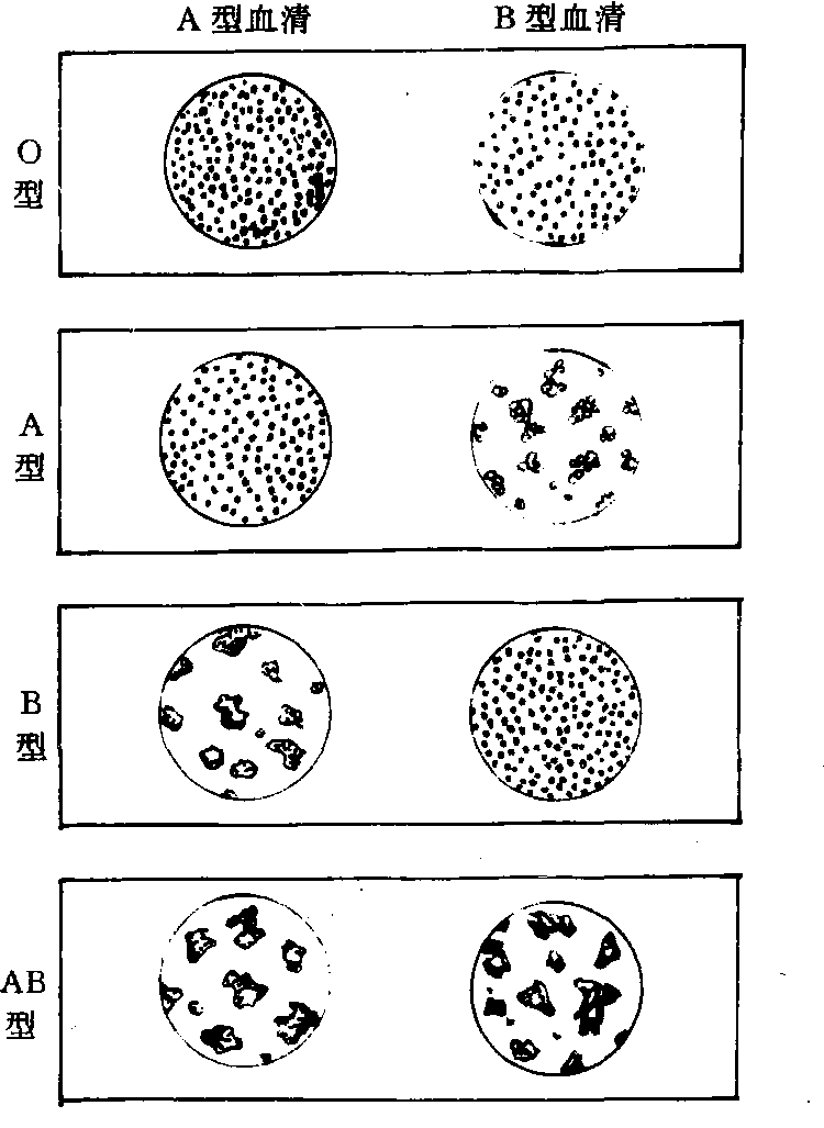 ☚ 血液凝固 交叉配血 ☛ 血型 血型xuexing人类血液的类型,是根据人类红细胞表面所含凝集原的不同来划分的。现已发现有十几个血型系统。如ABO、Rh、MN等血型系统,其中ABO、Rh血型系统在实践中具有重要意义。在ABO血型系统中,红细胞表面含有两种不同的凝集原,分别称为A和B凝集原。与此相对应,血清中就有两种不同的凝集素,分别称为抗A和抗B凝集素。它们是这样分配的:红细胞只含有A凝集原的,称为A型,其血清中含有抗B凝集素;红细胞只含有B凝集原的,称为B型,其血清中含有抗A凝集素;凡红细胞含有A和B两种凝集原的,称为AB型;其血清中既没有抗A也没有抗B凝集素;凡红细胞中A和B两种凝集原都没有的,则称为O型,其血清中含有抗A和抗B两种凝集素。因此,ABO血型系统可分A、B、AB、O四种血型。其中A凝集原不能与A凝集素相遇,B凝集原不能与B凝集素相遇,否则血液相互会发生凝集反应(红细胞粘聚在一起)。将受检者的血液经适当稀释分别滴入A型标准血清和B型标准血清中,根据出现凝集现象的情况即可鉴定受检者的血型(见图)。若红细胞不被A型血清和B型血清凝集,则此人的血型为O型;若红细胞不被A型血清凝集,被B型血清凝集,则此人的血型为A型;若红细胞被A型血清凝集,不被B型血清凝集,则此人的血型为B型; 若红细胞既被A型血清凝集,又被B型血清凝集,则此人的血型为AB型。近年来的研究发现,在某些特殊情况下,如患消化道肿瘤、新生儿或青年期免疫功能低下等,血型还会起变化,说明血型并不是终生不变的。 ABO血型系统中的抗原和抗体