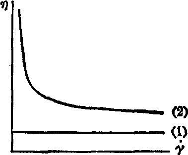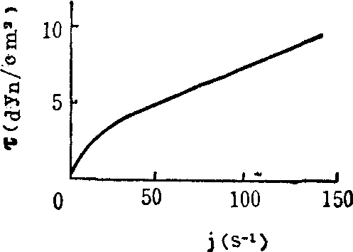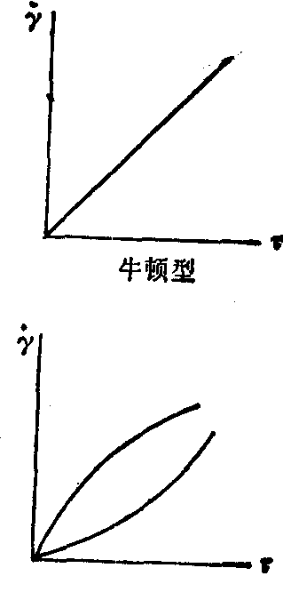 图1 牛顿型和非牛顿型流体的流动曲线,γ示切变率,τ示切变应力 球体,而血液中所含有的溶质一血细胞不是一个悬浮的刚性球体,而是一个悬浮的弹性圆盘体;❸一般悬浮液的溶剂是均质的,而血液的溶剂血浆不是均质的,其中约含6~9%的蛋白质,它对红细胞的聚集性和粘弹性有重大影响。由此可见,血液并非是一般的悬浮液。这就使得血液的流动性和量度这一流动性的粘度具有与一般悬浮液的流动性和粘度不同的特点。首先,从显示切变应力和切变速率之间的关系的流动曲线来看,血液与牛顿型流体截然不同,它的流动曲线不是通过原点的一条直线,而是不通过原点的一条曲线。(图1) 这说明血液不是牛顿