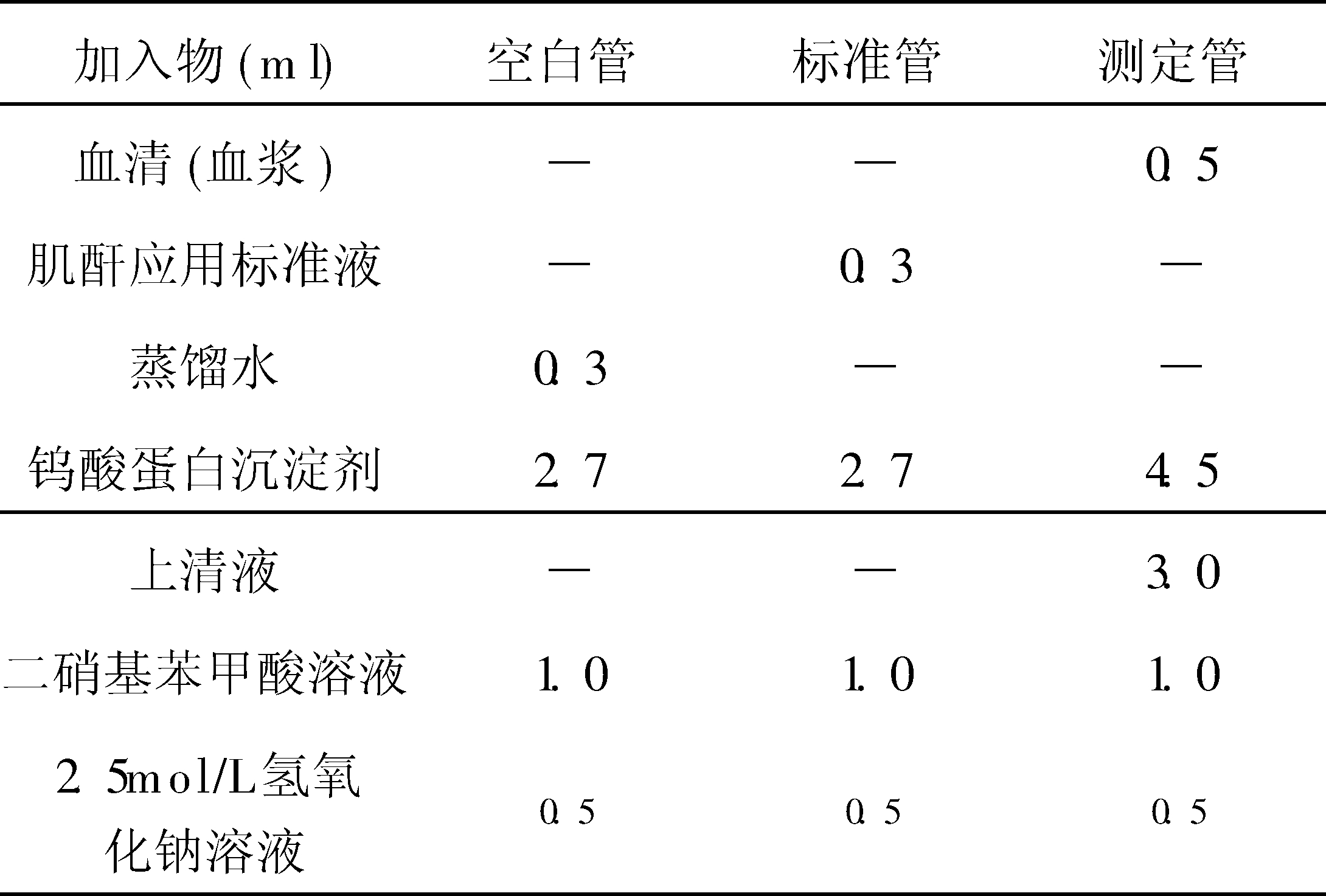 根据无蛋白滤液中肌酐与二硝基苯甲酸在强碱作用下生成橙色物质的原理,混合后用波长或蓝色滤光板比色,以空白管校正吸光度至“0”点,验取各管吸光度,最后计算出血肌酐含量。操作步骤如下: