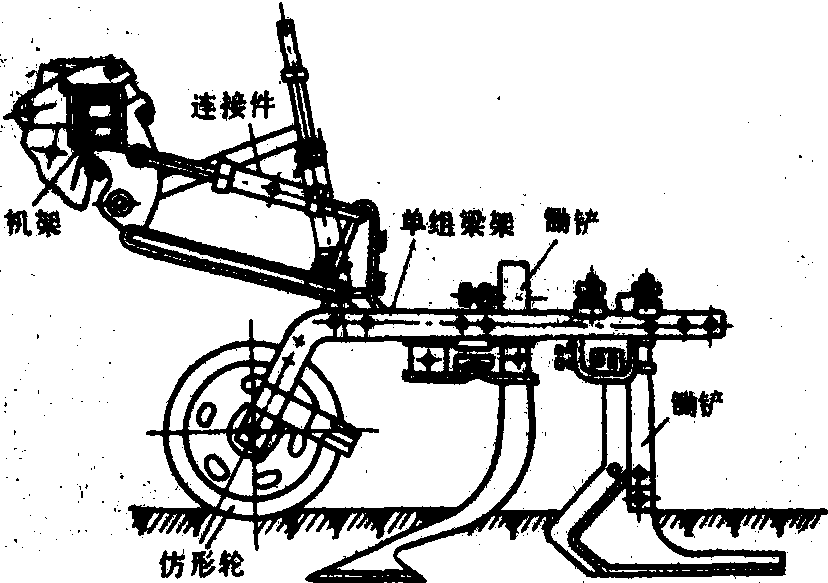 图1 中耕单组 工作部件 有除草铲、松土铲和培土器等。 除草铲 有三种型式,如图2。单翼铲由倾斜铲刀和垂直护板组成,并配置在紧靠苗行两侧。它的垂直护板起保护幼苗不被土壤覆埋的作用。作业深度为4~8厘米。双翼铲除草能力强而松土能力较弱,耕深较浅。双翼通用铲具有除草和碎土两项功能,工作深度可达8~12厘米。