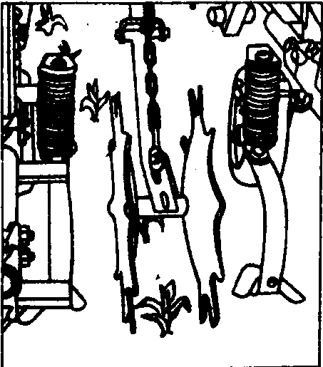 图7 多杆式仿形机构 回转式行间中耕机 具有回转式工作部件的中耕机。主要有以下几种类型: 驱动式旋转中耕机 工作部件由拖拉机动力输出轴驱动旋转。碎土性能好,不易缠草,耕后地表平整。为了防止工作部件抛土掩埋作物,旋转部件两侧加有护罩。 转动锄 是从动式旋转中耕机。工作部件是靠土壤阻力转动的齿盘(见除草机械)。对破碎板结层和坚实土块有较强的作用。 梳齿式苗间除草机 利用两个在横向垂直面内配置的梳齿盘在垄顶两侧相向旋转(图8)。梳齿的最深入土处在垄帮上,具有松土除草的作用。但也存在一定的伤苗率(最多达10%)。