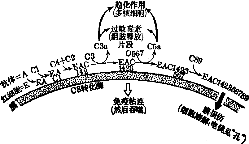 *不同作者,报告不一致。 补体各成分除C1q以外,在体内常以酶的前体形式存在。最初只知道抗原抗体复合物能激活补体,单独抗原或抗体不能激活补体。以后又发现,补体还可通过另一途径被多糖或凝聚的免疫球蛋白激活。前一种称为传统(激活)途径,后一种称为替代(激活)途径。 参与传统 (激活) 途径的11种补体蛋白分子,在其活化过程中,可分为三种功能单位: 识别单位,由C1q、C1r、C1s组成; 活化单位,由C2、C3、C4组成;膜攻击单位,由C5、C6、C7、C8和C9组成。同一功能单位的补体分子彼此有化学亲和性,激活后可相互结合在一起,共同执行一种生物学功能。其具体激活步骤简述如下。C1是由C1q、C1r及C1s三种成分依赖钙离子键结合成复合物的形式在血清中存在的。当抗原 (如绵羊红细胞)与抗体(IgM、IgG1、IgG2或IgG3)结合时,首先由C1q的六个羧基末端的类似六朵郁金花样的分子与抗体Fc分段结合,结合后发生构形改变使C1r活化,被激活的Ir (已被激活的补体成分用C 表示)再激活C1s,于是三者结合构成激活的CI,使C1从酯酶原变成酯酶。 然后CIs裂解C4为大分子的C4b和小分子的C4a; 同时裂解C2为大分子的C2a和小分子的C2b。C4b按抗体所指定的方位结合到细胞膜上,C2a再结合到C4b上, 构成C 。 C 是C3转化酶, 可激活C3,使C3裂解成大分子的C3b和小分子的C3a。C3b可与C 结合,并结合到细胞膜上或非特异地单独结合到细胞膜的另一部位上。 C 与C 的复合物C b 即为C5转化酶,裂解C5为大分子的C5b与小分子的C5a。C5b再与一个分子的C6和C7结合, 构成C5 三聚合物。此复合物通过C5b再结合到细胞膜的另一部位上。 C 又为C8提供了结合点,使C8结合到C 上。 此即开始诱导出细胞膜的轻度损伤。 C 又可与6个C9分子结合,而成为分子量超过1,000,000的复合体,促使细胞溶解。但细胞裂解是否确需C9参加,尚不十分了解。这一溶解细胞的机制,对于破坏外来的细胞,包括细菌和移植组织在内,可能是重要的。这一机制在自身免疫病中也可能很重要,可使宿主的自身组织遭到免疫性攻击。在传统激活途径中,补体各成分裂解而游离出的小分子片段,在免疫反应中也有重要的作用,如C3a和C5a有过敏毒素的作用,能引起肥大细胞和嗜碱粒细胞的脱颗粒作用,释放出细胞内所贮存的有生物学活性的胺类; C5a比C3a及 对中性粒细胞有更强的趋化性,在协调对抗原的免疫应答和非特异性炎症应答中有重要意义。
