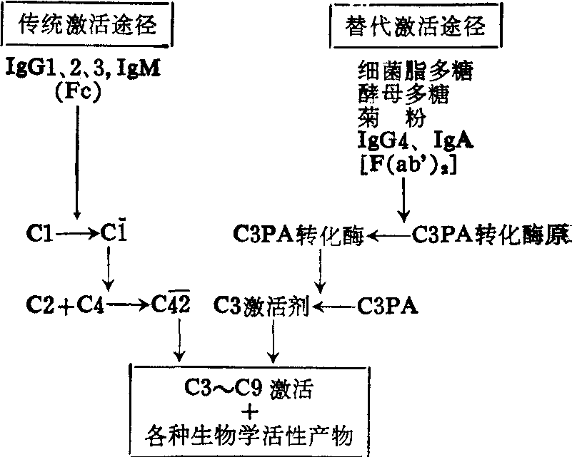 补体系统传统激活途径简化示意图 替代(激活)途径是近年来发现的。若干种植物多糖、细菌内毒素、蛇毒、血浆素、备解素、胰蛋白酶、凝聚的免疫球蛋白等皆可不经过C1而直接激活C3完成后继补体成分的激活过程,因而称此激活途径为替代(激活)途径。C3之所以能被激活是由于正常人血清中有C3激活剂前体(C3PA,又称B因子)。C3PA通常以非活化状态存在。当本来存在于血清中的C3激活剂前体转化酶原与多糖等结合后即被激活成C3激活剂前体转化酶 (C3.PAse,又称D因子)。此C3PAse使C3PA转化为C3激活剂而激活C3。