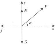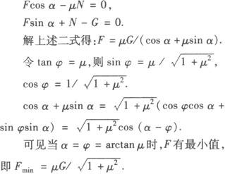 当C点上移时,θ增大,sinθ增大,tanθ增大,所以T减小,F支减小. 根据牛顿第三定律,杆所受压力N与F支大小相等,方向相反,所以压力N减小. 也可以用平行四边形的知识,从图上直接判定,即当绳子的固定点由C上移到C′后,由于G不变,F绳不变,所以T与F支的合力F′=F绳=G不变,即平行四边形的对角线长度不变,当两力夹角减小时,对角线的两条邻边均变短,即F支、T均变小. 答 A. 例2 重量为G的木块与水平地面间的动摩擦因数为μ,一人欲用最小的作用力F使木块做匀速运动,则此最小作用力的大小和方向应如何? 分析 木块在运动中受摩擦力作用,要减小摩擦力,应使作用力F斜向上,与水平方向成适当的夹角 解 设当F斜向上与水平方向的夹角为α时,F的值最小. 木块受力分析如图所示,由平衡条件知: