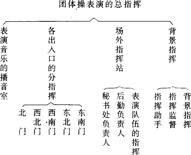 | 释义 | 表演指挥系统 表演指挥系统团体操表演是一项复杂而又细致的工作,需要严密的组织和有效的指挥才有可能顺利进行。下面是在北京工人体育场举行全运会时团体操表演的现场指挥系统的实例介绍。