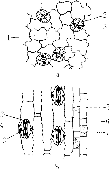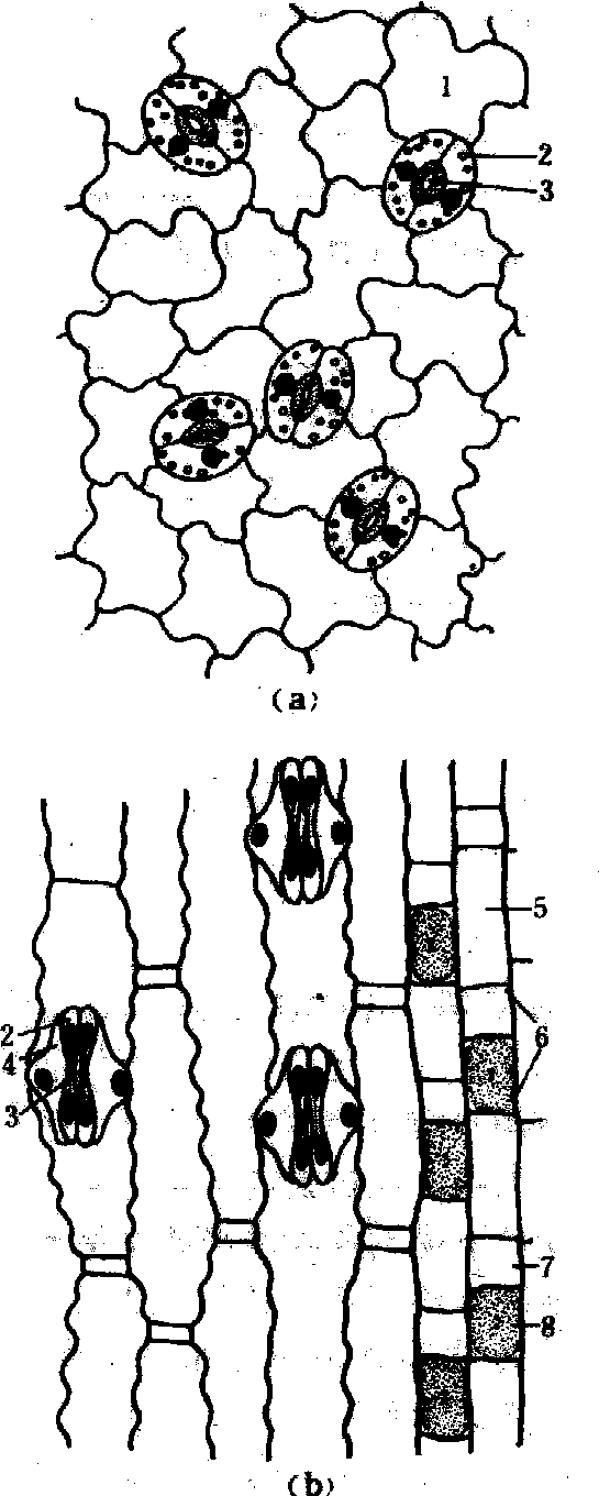 叶片表皮的气孔器最多。背腹型叶、下表皮的气孔器多于上表皮; 等面型叶的上下表皮气孔器数目相近; 漂浮水面的叶片,气孔器仅限于上表皮; 沉水植物叶片没有气孔器。单位面积气孔器数,阳生植物比阴生植物多,木本植物比草本植物多。具网状脉叶片的气孔器呈不规则星散排列,而平行脉的气孔器呈纵行排列。 保卫细胞通常呈肾形,细胞壁厚薄不均,近气孔的一侧较厚,邻接表皮一侧较薄,细胞壁纤维素的微纤丝呈辐射状排列。随着体内生理状况的变化,保卫细胞中糖分增加,吸水膨胀,壁厚处扩张较少,壁薄处扩张较多,因而2个保卫细胞相对弯曲,致使气孔开启。当保卫细胞失水降压时,扩张处缩还原状,气孔关闭。禾本科植物的保卫细胞呈哑铃形,两端壁较薄,中部壁较厚。当吸水时,壁薄的两端膨大,以致中部相互分离,气孔启开; 失水时,两端萎软,气孔关闭。 表皮附属物 有些植物的表皮上有毛状体附属物,由表皮细胞突起形成,为单细胞或多个细胞构成,如腺毛、腺鳞(见分泌结构)、乳头状突起、表皮毛、星状毛等。一般认为毛状体有对增强表皮的保护作用。 表皮epidermis❶动物被皮(皮肤)的最外层上皮。陆生脊椎动物由复层扁平上皮构成。哺乳类的有毛表皮由里向外包括基层、棘细胞层、颗粒层和角质层。而无毛或厚皮肤的颗粒层与角质层间还有透明层。表皮主要由角质形成细胞组成,此外还有黑色素细胞、郎格罕细胞和麦克尔细胞。基层亦称生发层,细胞位于基膜上,分裂增生能力最强,不断将增殖的细胞向浅层依次推移,补偿表面角质层细胞脱落的损失,维持表皮厚度相对恒定,基膜连接真皮。表皮内无血管,营养物质等经过通透性很强的基膜由真皮入表皮。有保护、防御、感觉及防止汗液丧失等功能。