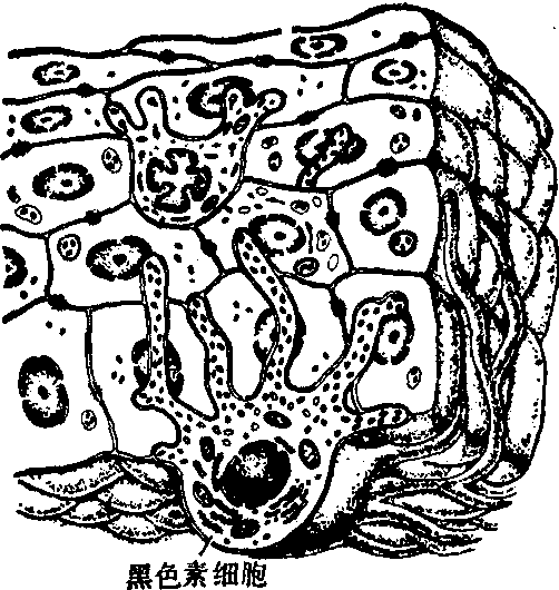 图2 表皮角质形成细胞模式图 1.角化细胞 2.加厚的细胞膜3.透明角质颗粒 4.膜被颗粒 5.桥粒 6.张力丝 7.棘细胞8.基底细胞 9.核糖体 10.张力丝 11.半桥粒 12.基板 角化是上皮细胞的分化过程。基底层细胞不断分裂;新生的细胞分化并失去分裂能力,渐向浅层移动,最后死亡并脱落。细胞分化包括合成和解体二个阶段。在合成阶段,细胞产生大量张力丝、透明角质颗粒和板层小体。张力丝和透明角质颗粒主要为核糖体合成的蛋白质。板层小体含大量双极脂和一些水解酶,这些酶大概参与小体内容物释放。细胞充满这些结构后,板层小体的界膜与细胞膜融合,将内容物释出细胞,布满细胞间隙并敷于细胞表面。此物主要为双极脂,构成表皮不易透水的屏障。以后细胞核消失,细胞器被酶分解。张力丝存留,透明角质颗粒变成均质的基质,二者结合成纤维性-无定形的角蛋白,外包加厚的细胞膜。角化层的坚固和化学耐受性主要在于所含的角蛋白。张力丝的纤维性蛋白含硫少,其基本单位是三股二聚体。每个二聚体长20nm,于X线衍射时显α-螺旋结构。均质状基质的蛋白有许多双硫键,不易溶解。纤维性蛋白与无定形蛋白结合,使角化细胞结构坚固,并有韧性和弹性。细胞膜内层显著增厚。此层的无定形蛋白富有双硫键和未确知的耐受键,其化学耐受性很强,它使角化细胞不易损坏。 黑色素细胞 此种细胞主要散在于表皮基底层和毛囊,真皮中也有少数。因它们能产生黑色素,故称此名。中枢神经系的某些部位和眼视网膜也有此种细胞,但它们只在胚胎期和幼年产生色素。细胞的特点是含黑色素生成所需的酪氨酸酶。剥离小片表皮,用合成黑色素的中间体——多巴(1,3,4-二羟苯丙氨酸,简称DOPA)孵育,见细胞呈多突状。普通染色的标本中,细胞呈小圆形,胞核圆形,胞质含少许黑色素颗粒。它们起源于胚胎期的神经嵴,在第10周时移入真皮,12~14周时见于表皮基底层。其数量身体各部皮肤不一,前额和阴囊约2000个/mm2,其余部位约1000个/mm2,个体和种族间差异不大。 电镜下见细胞呈多突形,含丰富的游离核糖体和粗面内质网,高尔基复合体明显,有少量张力丝。它们与相邻细胞间不见桥粒(图3)。主要特点是胞质中有黑色素体。黑色素体的大小、形状和内部结构不一。近成熟的小体呈长圆形,长0.6μm,宽0.2μm,有界膜包裹。酪氨酸酶由核糖体生成,经粗面内质网和高尔基复合体加工,包含于有界膜的小泡中。这些小泡为初形成的黑色素体。以后小体内出现顺长径配布的细丝和板层。再后,小体内出现致密的黑色素,内部结构被掩蔽,成为黑色素颗粒。色素颗粒进入细胞突起,输入上皮细胞(图3),色素输入上皮细胞的机理不明。一个黑色素细胞与一定数目的上皮细胞建立功能的联系,向它们供应色素,称表皮-黑色素单位。身体各部黑色素细胞与表皮细胞的比例不等,平均为1:36。