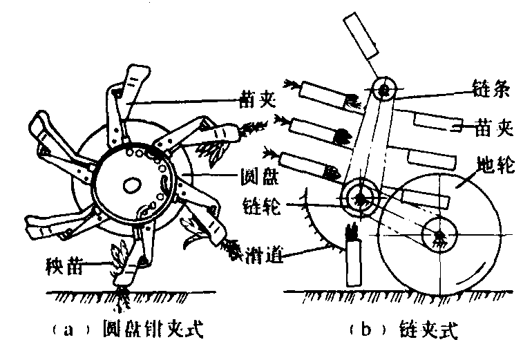 裸根苗栽植机soilless seedling transplanter将育成的裸根苗栽植到田间的机械。也称无钵苗栽植机。一次作业可完成开沟、栽苗、浇水、覆土和镇压等工序。适用于栽植油菜、玉米、高粱等作物。相对钵苗栽植机而言,机组轻巧,苗箱载苗量大。 20世纪30年代,苏联、英国、美国和德国等相继研制出不同结构型式的裸根苗栽植机,广泛使用的是人工供苗、机械栽植的半自动栽植机。中国从70年代开始研制旱作裸根苗栽植机,最初用于玉米移栽。80年代初研制成适于栽植蔬菜的裸根苗半自动栽植机。 裸根苗半自动栽植机主要由栽植器、开沟器、覆土器、秧箱及传动机构等组成。通过地轮带动栽植器运转,操作者直接或通过中间机构间接将秧苗供给苗夹,秧苗随着苗夹旋转到与地面垂直位置时,苗夹脱离滑道控制而松开,秧苗落入由开沟器开出的栽植沟内随后覆土镇压。人工供苗的频率为每人每分钟40~50株。为保证栽植后秧苗能垂直于地面,栽植器必须符合“零速原理”,即苗夹的圆周速度与机器前进速度大小相等,方向相反,使苗夹与土壤的瞬时相对速度等于零。 栽植器是栽植机的主要工作部件。按结构型式可分为圆盘钳夹式、链夹式和挠性双圆盘式。圆盘钳夹式栽植器[图(a)]的苗夹固定在旋转的圆盘上作圆周运动;链夹式栽植器[图(b)]的苗夹安装在循环运转的链条上,可使供苗区内苗夹数大于2,且供苗时的移动线速度低于栽植时的线速度,有利于人工供苗,提高供苗的准确性。挠性双圆盘式栽植器由两个可以弯折的圆盘组成。两个圆盘同时转动,在一定角度位置互相接触夹住秧苗,至垂直地面位置时松开,秧苗落入栽植沟内。这种栽植器在圆周任何位置都可夹秧苗。有的栽植器由一个橡胶圆盘和一个金属圆盘组成。栽植手将秧苗放入供苗输送带上,由输送带送入两个圆盘之中而被夹住,带到栽植沟里。若栽植机采用双橡胶圆盘栽植器与卷苗机配套使用时,应预先将秧苗夹在两条带子中间制成苗捆。栽植时,逐渐打开苗捆,秧苗被两个橡胶圆盘夹住,进行自动栽植。