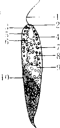 裸藻属 (前端示切面观,后端示表面观) 1. 鞭毛 2. 胞口 3. 胞咽 4. 贮蓄泡 5. 眼点 6. 收缩泡 7 . 叶绿体 8. 副淀粉 9. 细胞核 10.表膜 |