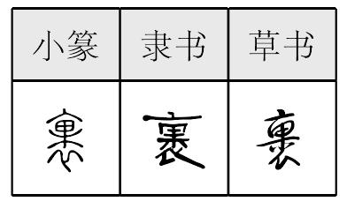 古代名物 > 花卉類 > 總屬部 > 諸名 > 裹 裹 guō 草之果實。《文選·郭璞<;江賦>;》:“翹莖瀵蘂,濯穎散裹。”李善注:“裹,謂草實也。” 裹guǒ〖动词〗 包,带着(1)。《李陵答苏武书》:而裹万里之粮,帅徒步之师,出天汉之外,入强胡之域。——而[我]带着远行万里的粮食,率领步行的队伍,走出汉王朝统治区以外,进入强大的胡人区域。 裹guǒ❶ 包,缠。杜甫《兵车行》:“去时里正与~头,归来头白还戍边。”邵长蘅《阎典史传》:“应元命用铁叶~门板。” ❷ 包容。《吕氏春秋·本生》:“其于物无不受也,无不~也,若天地然。” ❸ 包裹着的东西。王维《酬黎居士淅川作》:“松龛藏药~,石唇安茶臼。” ❹ 量词。包。用于包裹着的东西。《穆天子传》卷二:“珠四百~。” 裹△裡liD159 “里(里面)”的繁体。