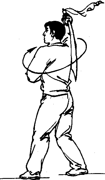 刀法。右手持刀使刀平抡至右后侧,刀尖下垂;刀背必须贴近背后绕过左肩,用力翻腕平抡和撤回,速度要快;刀在后绕转时,用力要柔,头部保持正直,两手动作要配合一致。参见“缠头刀”条。