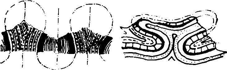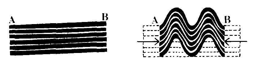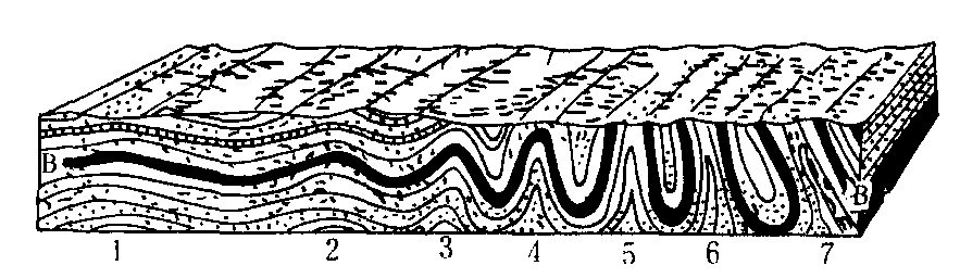 褶皱构造 1,2.微弱褶皱;3, 4,5. 强烈褶皱;6, 7. 等斜褶皱