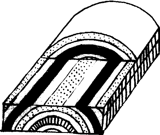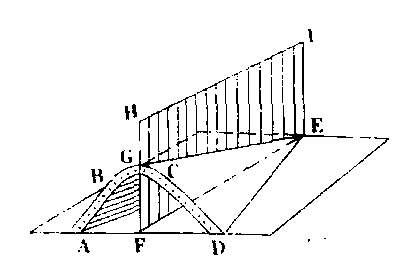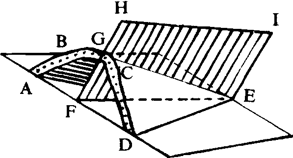 图1 褶曲要素 AB、CD. 翼; 被ABGCD包围的内部岩层. 核;BGC. 转折端; GE. 枢纽; HIEF. 轴面; FE. 轴 褶曲有两种基本形式,即背斜和向斜。向上凸出的褶曲,岩层自轴面向两侧倾斜,或者更确切地说,褶曲的核部为老岩层,两翼为新岩层的褶曲称为背斜;向下凹的褶曲,岩层自两侧向轴面倾斜,或者更确切地说,核部为新岩层,两翼为老岩层的褶曲称为向斜。由于褶曲的形态是多种多样的,例如图2中D、E所表现的形态,只凭上凸、下凹是无法断定哪是背斜和向斜,因此只有根据核部和两翼的新老关系,才能区别开来,所以,在上述背斜和向斜的概念中的后一半表述才是最正确的。按褶曲形态可以分成许多类,从褶曲横剖面形态看,根据轴面产状可以分为直立、倾斜、倒转、平卧和翻卷等5种褶曲(如图2)。根据转折端形状及两翼特点可以分为: 箱形褶曲 (图3)、锯齿状褶曲(图4)、等斜褶曲 (图5)、扇形褶曲 (图6) 等。