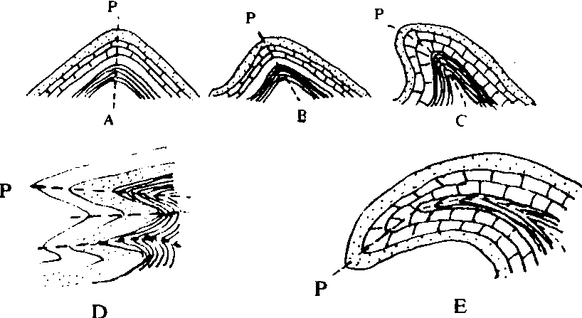 图2 根据轴面 (P) 产状划分的褶曲横剖面形态 A. 直立褶曲; B. 倾斜褶曲; C. 倒转褶曲;D. 平卧褶曲; E. 翻卷褶曲