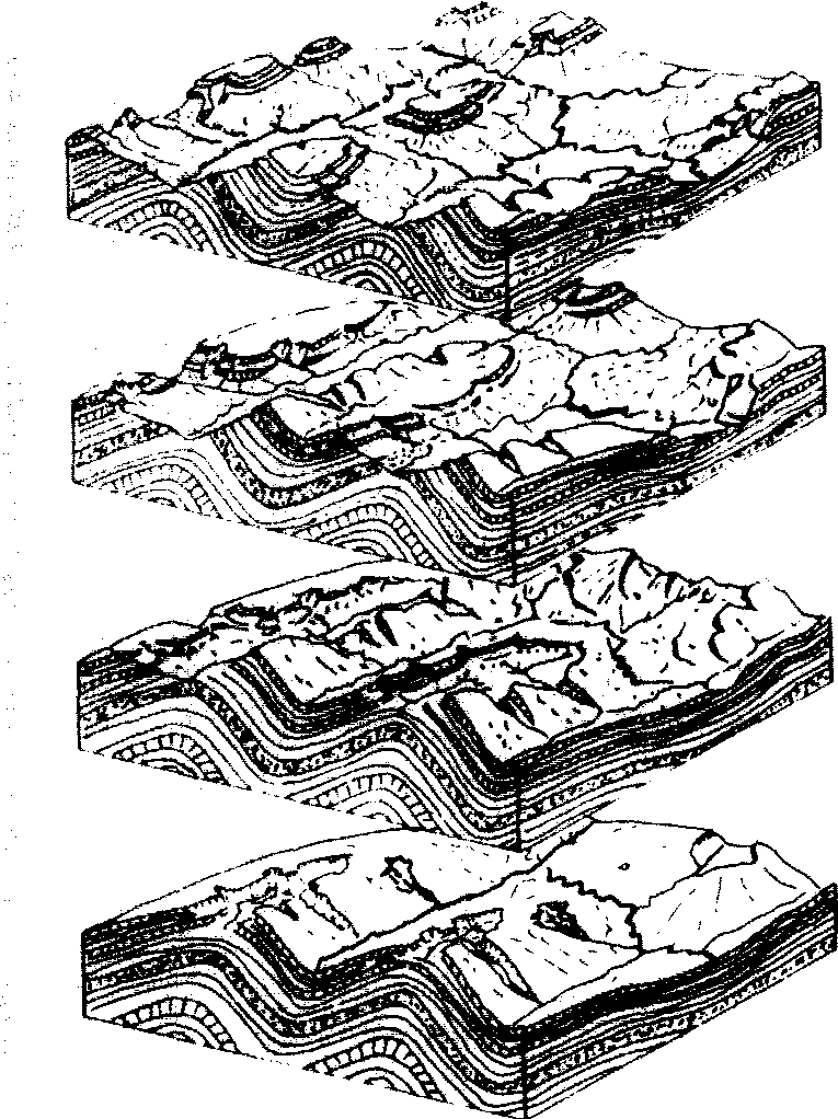 ❷背斜与向斜地貌:在构造活动强烈的褶皱地区,如侵蚀切割速度未能超过构造作用的速度,形成了背斜山和向斜谷的地貌形态。在长期剥蚀和侵蚀的过程中,由于背斜轴部张节理比较发育,侵蚀作用进行得较快,背斜山就可能逐渐演变成背斜谷地,而两侧的向斜谷则变成向斜山,这种现象在地貌上称为地形倒置(图1)。