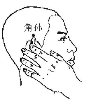 图81 角孙jiǎosūn经穴名。代号SJ20。出《灵枢·寒热病》。属手少阳三焦经。位于耳尖上方之发际处,折曲耳廓取穴。主治目翳、急性结膜炎、腮腺炎、偏头痛、项强。沿皮刺0. 3 ~0. 5 寸。