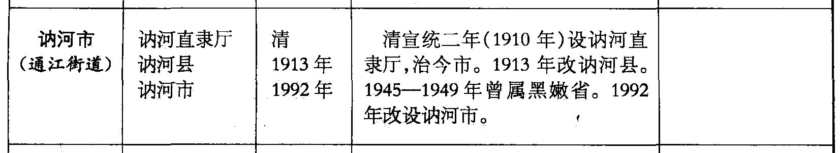 讷河市(通江街道)讷河直隶厅讷河县讷河市清1913年1992年清宣统二年(1910年)设讷河直隶厅,治今市。1913年改讷河县。1945—1949年曾属黑嫩省。1992年改设讷河市。