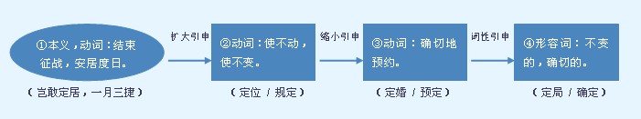 | 释义 | ![]() 肯定;不可更改: ~可取胜|~能及时赶到|~能夺取冠军|~要和敌人斗争到底。 必 bì ★ “定”语意较轻,属于书面语,多与“能、要、可”等表示意愿的词连用。“必”突出动作或现象一定出现,如说“势在必行、物极必反、必胜无疑”。 ❶平静;稳定。 a.常用作语素构成合成词。 立~|安~|稳~|奠~。 b.作谓语,一般用于固定词组。 痛~思痛|心神不~。 c.作补语。 坐~|站~。 ❷已经确定的;不改变的。常作补语。 等过几天住~以后,再给她写信|我当教师,当~了。 ❶决定;使确定。可重叠。 a.作带宾、带补谓语,宾语可以由主谓词组充当。 ~地点|~方案|~~婚期|厂长~了他去北戴河疗养一段时期|这个价格~得很便宜|参加大会的人数还~不了|会期还没有最后~下来|座谈会~在星期日|今天已经~出几条解决问题的办法了|大局已~|计划已经~了。 ❷使平静;使稳定。多用于情绪。可重叠。可带动态助词“了”。常作带宾、带补谓语,宾语限于“心”“神”“魂”等少数几个词。 ~~神再说|这番话~了他的心|孩子去向不明,他的心怎么能~下来?|她惊魂未~,喘息不止。 ❸固定;使固定。 a.用作语素构成合成词。 ~睛|~影。 b.作带补谓语。 我的两脚挪也挪不动,好像~住了|眼睛~在书上。 ❹先期约定。可重叠,作带宾、带补谓语。 他在那儿~了酒席|我和他~好了七点见面。 必定;一定。多用于书面语。作状语。 ~可取得胜利|~能成功|这事不~是谁干的呢?|~有原因|~来相会。 【辨】 定和订:见“订”。 【词语】 定案 定当 定都 定夺 定额 定购 定规 定价 定见 定居 定居点 定局 定礼 定理 定例 定量 定量分析 定律 定论 定苗 定名 定盘星 定期 定钱 定然 定时炸弹 定位 定息 定弦 定心丸 定型 定性 定义 定音鼓 定语 定员 定准 字源解说 定,甲骨文 附 文言版《説文解字》:定,安也。从宀,从正。 附 白话版《说文解字》:定,安稳。字形采用“宀、正”会义。 引申线索 ![]() 【字族索引】 定 【同音字】 dìng |