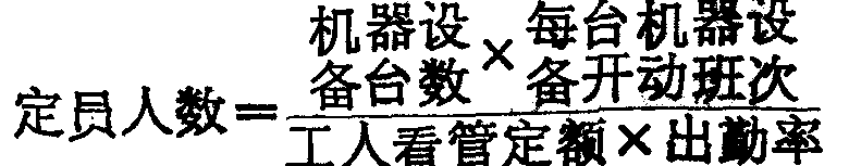 指按照机器、设备的数量、规格,开动班次以及工人的看管定额、出勤率等因素来计算的定员。其计算公式为:
