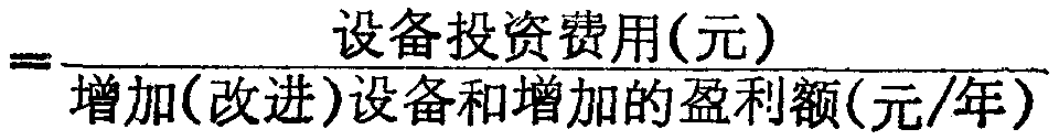 设备投资费用指进行设备投资所发生的费用支出;增加(改进)设备后增加的盈利额指由于增加或改进设备,增加生产能力或提高设备利用效率而使盈利额每年增加的数额。 设备投资回收期应是越短越好,回收期短反映收回投资快。 |