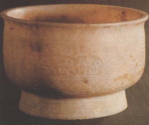 ◎殷商 1976年河南安阳殷墟妇好墓出土 高10.8厘米 口径16.8厘米 壁厚0.6厘米/中国社会科学院考古研究所藏 ●该器出土时置于椁顶上,造型典雅、庄重,有青铜器的风格特征。 玉料呈浅青色,局部有黄褐色浸斑。圆形,侈口略向内收,翻唇。 腹部饱满,舒展自然。圈足部分上收下展,并与口部抛物线形成呼应与对比的关系。周身纹饰采用三段式连续纹样。稍宽的中部以兽面纹为主体,上段为三角形回纹,下段为菱形带纹。足底沿饰云纹与目纹。所有纹饰均以阴线琢刻。 通体兽面纹图形与几何形图案和谐统一,显示了当时制玉工艺的水平。 |