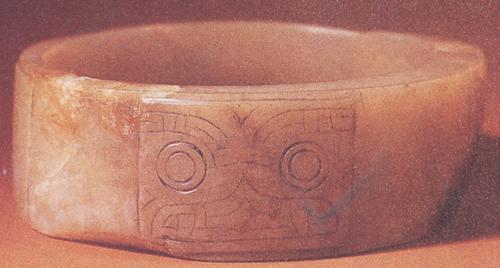 ◎新石器时代(良渚文化早期) 1977年江苏吴县张陵山上层墓葬出土 高3.4厘米 孔径8.2厘米 阳起石/南京博物院藏 ●此器为扁圆环形状,似是可以戴在腕部的饰品。 表面加工琢磨精细,充分显现出软玉晶莹润泽的材质特性。造型外壁以相对相背的构图形式,安排四个相同的长方形兽面纹图案。 由于采用剔地阴刻的工艺手法,使图形部分呈微凸的浮雕效果,并与空白区域形成了虚实对比。 兽面纹以左右对称方式组织:一双环形的眼睛圆睁,额头微皱,双眉翘起,阔盆大口,獠牙巨齿,给人一种威严、神秘之感。 这种适合基本轮廓(几何形)的兽面纹是良渚文化早期的代表纹饰。该镯对研究良渚文化兽面纹的产生与衍化有重要价值。 |