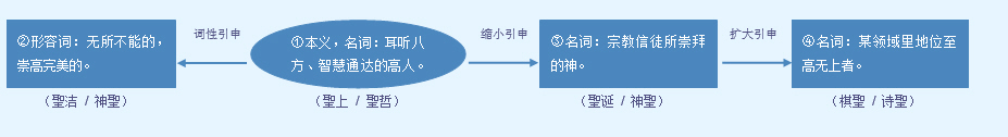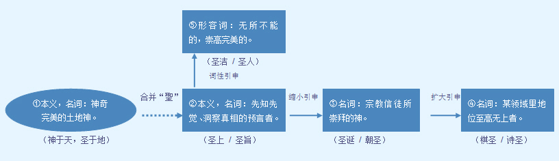 字源解说 本 字 “圣” 圣,甲骨文 = (共,供奉)+ (土),供土,表示所敬拜的土地神。在古人眼中,滋生万物的土地奇而完美。造字本义:神奇完美的土地神。有的甲骨文 将“共” 简化成“又” ,三点指事符号 表示土屑。古匋字形 将“土”的形象简化成 。篆文 与古匋字形相同。古人称主天者为“神”,称主地者为“圣”。 合并字“聖” 聖,甲骨文 像长着大耳 的人 ,表示耳聪大慧者。中国远古祖先认识到,善听是内心宁静敏感者的超凡能力,能在自然环境中辨音识相者,是大觉悟的成道者。有的甲骨文 加“口” (说,预言),表示预言。造字本义:先知先觉、洞察真相并能预言者。金文 将甲骨文字形中的“人” 写成“壬” (能力超群者),突出“聖”者的超凡“能力”。篆文 明确“壬” 的字形。注:由于“圣”、“聖”本义相近,唐宋之后多以“圣”代替“聖”;《汉字简化方案》以“圣”合并“聖”。 圣 文言版《説文解字》:圣,汝潁之閒,谓致力於地曰圣。从土,从又。 圣 白话版《说文解字》:圣,汝河、颍水一带,人们将致力于土地的开发利用称作“圣”。字形采用“土、又”会义。 聖 文言版《説文解字》:聖,通也。从耳,呈聲。 聖 白话版《说文解字》:聖,通达者。字形采用“耳”作边旁,采用“呈”作声旁。 引申线索