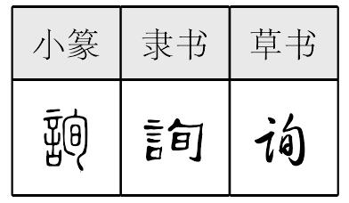 | 释义 | 询 询xún征问,谋划。《小雅·皇皇者华》五章: “载驰载驱,周爰咨询。”毛《传》:“亲戚之谋为询。”朱熹《集传》:“询,犹度也。”《大雅·皇矣》七章:“询尔仇方,同尔兄弟。” 马瑞辰 《通释》:“《后汉书》伏湛言;文王受命伐五国,必先询之同姓。然后谋于群众。”朱熹《集传》:“仇方,雠国也。兄弟,与国也。”与,盟。 ☚ 诡随 详 ☛ 询读音x·ün(ˊ),为ün韵目,属en-in-un-ün韵部。相伦切,平,谆韵。 上一条: 荀 下一条: 詢 询〔xun〕 ![]() ![]() 询詢xún询问 询问:~问︱查~︱探~︱征~︱咨(zi)~︱质~︱垂~。 询xún询问:查询︱咨询。 询xun询查 询访 询问 查询 探询 征询 咨询 询谋佥同1 询事考言2 询于刍(chu)荛3 (rao) 询(同)讯 问 诘 询xún询答、应;问、询○答dá(动)回答:~复|~辩|~疑|~话|~词|~案|~卷|~数|回~|应~|解~|笔~|奉~|问~|一问一~|~非所问|对~如流 ○应yìng(动)回答:~答|~对|答~|回~|呼~|互相呼~|其~如响|遥相~和|一呼百~。 ●问wèn(动)提出问题:~讯|~答|~题|~事处|反~|试~|查~|追~|盘~|责~|喝~|垂~|提~|发~|请~|疑~|~道于盲|刨根~底|追踪~迹|入国~禁|入境~俗|无人~津|质疑~难|不耻下~|反躬自~|扪心自~|明知故~|答非所~。 ●询xún(动)询问:~问|问~|问~处|~问病状|~问道路|问~公司情况|探~对方意见。 询xún〖动词〗 询xún❶ 询问,咨询。《诗经·大雅·板》:“先民有言,~于刍荛。”(刍荛:割草打柴之人。)刘开《问说》:“舜以天子而~于匹夫。” 询*詢xunD1AF 查考 查考询(询究) 考案 追考 检坐 质究 钩校 究度 究诘 检详 体度 按省 按寻 按试 稽核 稽酌 考稽 考究 另见:调查 研究 考核 证实 说明 ☚ 查考 考证 ☛ 确实 确实实(实落;实实;实确;实然;定实;着实;端实;煞实;其实;信实) 委(委是;委实) 谅 底 恂 询 洵(~属可贵) 的(的的;的确;的真;的当;的实;端的;委的) 凿(凿凿;凿然) 固诚(~非所料;~有其人) 谌 镌(~如所言) 真(真个;真是;真成;真正;真来;当真;认真) 展(~也有成) 良 允(允洽) 确乎 确切 确核 确然 明白(援证~) 道地 不假 另见:证据 凭证 是 正确 无错 结论 ︱虚假 ☚ 确实 非常确实 ☛ 询问 询问询(询叩;访询;咨询) 讯(讯问;讯诘;讯访;访讯;考讯) 诹(诹询) 诘 请 叩(叩问;叩咨) 问(问取;问话;问询;问语;问审;问道;顾问;说问;展问;取问;攀问;言问;讥问;寻问) 闻 谉 谘白 谇候 另见:征询 征求 打听 意见 ☚ 反问 问事 ☛ 询詢xún相伦切,平谆。 询xún询问,征求意见。如:探询,查询,咨询。 询(詢)xún (询问) ask; inquire: 查 ~ make inquiries (about); 征 ~ seek the opinion of; consult 询詢xún(8画) *询(詢)xún8画 言部 征求意见;探问: 探~|咨~|质~。 询詢xún秦代竹简有询(詢)字。两汉、六朝继承。古书《尔雅》《诗经》都有,也或用恂字(信心义),或用洵字(本指㳡水的别支。假借为诚然,实在义)。《说文》漏收(宋初徐铉《说文·新附》有),但梁代《玉篇》,宋初《广韵》等都有。询是从讠(言)、旬声的形声字。《玉篇》说询是咨询义;即询问,求教义;也有问,征求意见义。如:探询|查询。组词如:询问|咨询(现咨询的咨规范作咨,《通用字表》不收谘(諮)字。《新华字典》等以諮为咨的异体)。又有谋,查考义。 询詢★繁◎常★常