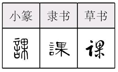 kè課,形声,从言,果声,本义为按规定的标准考察试用,引申为按规定的时间和数量征收赋税、赋税、按规定的内容分段教学或学习、教学上的一个阶段或科目、教材中一个相对独立的单位等。《简化字表》类推简作“课”。 |