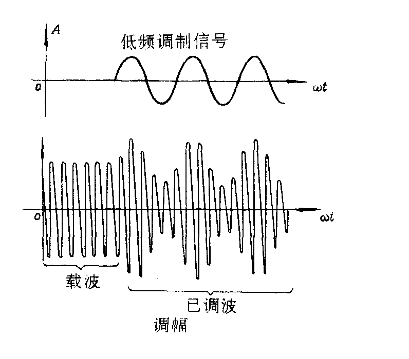 式中A0、ω0和ᵠ0分别为载波的振幅、角频率和初相,即正弦波的三要素。对载波而言,它们是三个常数。使载波的这三个要素之一随欲传输或发送的调制信号的变化而变化,就是调制。已经调制信号调制的高频电振荡或电磁波称为已调波。在调制过程中,使载波的振幅随调制信号而改变的调制方式叫做调幅或振幅调制。经过调幅后的已调波(即调幅波)的振幅,按照声音、图像和其它欲传送信号的强度而变化,从而反映欲传送信号的变化规律。图1示出了载波和调幅波的波形,图中的调制波为一低频正弦波,调幅波的振幅随低频正弦波变化而变化。这反映在它的包络线上。调幅是传送信号用得最广泛的一种调制方式。 在调制过程中,使载波的振荡频率随调制信号而变化的调制方式叫做调频或频率调制。经过调频后的已调波(即调频波),它的瞬时频率偏离载波频率的量与调制信号的瞬时值成比例,而振幅则保持不变,图2为调频波的波形。与调幅系统相比,调频系统有抗干扰性较强和设备利用效率较高等优点。但是调频波占有的频带却远较调幅波为宽,因此调频系统必须工作在超短波波段。 在调制过程中,使载波的位相随调制信号而变化的调制方式叫做调相或位相调制。经过调相后的已调波(即调相波),它的瞬时相角偏离载波相角的量与调制信号的瞬时值成比例,而振幅则保持不变。除了上述的连续波调制外,还有所谓的脉冲波调制。