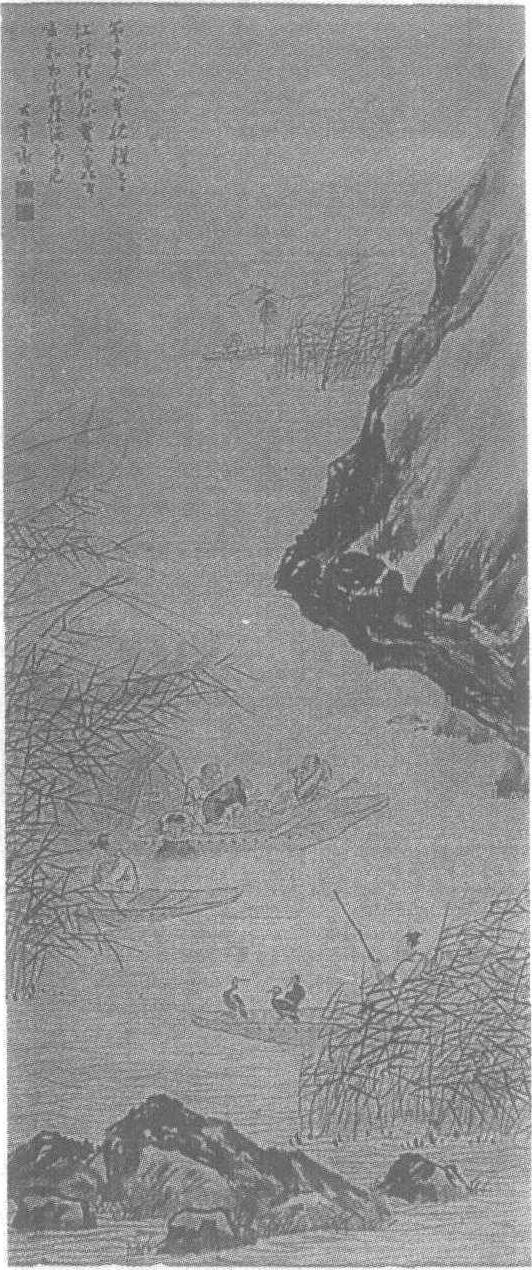 | 释义 | 谢彬渔家图轴 谢彬渔家图轴清。谢彬绘。纸本设色。纵168.1厘米,横73厘米。上海博物馆藏。谢彬(公元1602—?年),字文候,号仙翟,浙江上虞人,家钱塘(今浙江杭州)。为曾鲸门下的得意弟子。善画写真和人物,亦画山水,笔墨苍浑,气韵生动,闻名南北。此图采取风俗画绘画形式,真实地反映了渔家愉快的生活。图中的山崖仅取一角,突兀而立,以大刷笔皴染,气魄雄浑。江水宽广悠远,泛起道道清波,几只渔船聚拢在缓流处。周围是一丛丛挺秀婀娜的芦苇,一位妇女边为幼儿哺乳,边向远处张望。渔人们散坐于船舱外开怀畅饮,还有人用渔篓在水中淘洗。一条向此靠拢的船上几只鱼鹰立于船头休憩。远处的芦苇丛边另有一舟,渔人双足荡于水面悠然奏笛,观其形态,显然更乐于远离人群而自娱。整个画面给人以安详、和乐的感受,所表现的渔人质朴的生活令人欣羡。款署“古雪夫谢彬”,下钤〈谢份〉、〈文候〉两印。此外,与此题材类似的有《渔乐图》,著录于《知渔堂书画录》。