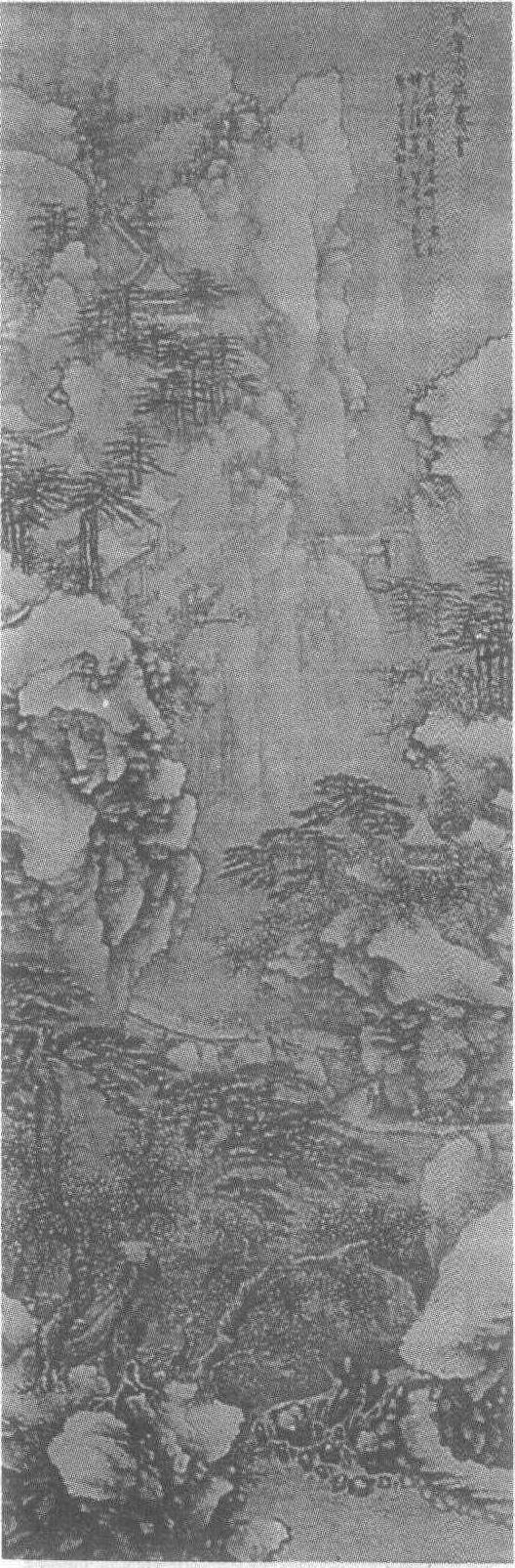 明。谢时臣(见《谢时臣虎阜春晴图轴》条目)绘。绢本设色。纵296厘米,横100厘米。山东省青岛市博物馆藏。此图绘武当山南岩雪后的景色。岗岭重叠,松木挺立茂密。近处泉流潺潺,右下一条小路沿山直通上方山岭。左、右绘挺拨峭立的山峰,树木环抱着亭台楼阁。赏景的游人在亭间游玩、戏耍。两山之间留有空隙,以示幽谷的森奥和深不可测,显出了山势的高峻峭拔。两桥飞卧,把两山连接起来。栈道上,游骑行旅不断,都是趁雪后初晴进山观赏雪景的人们,极尽生活之情趣。此图设色雅丽清爽。峰峦山石、树木屋顶以及远山皆留白,天空淡墨烘染,显得大雪很厚,寒气逼人,一片白茫茫的景象。白雪绿松,名山胜迹,更显山河的壮美。笔墨严谨,构图巧妙,气势雄伟。右上自题:“武当南岩霁雪。”此图是谢时臣大章法的山水画,作于明嘉靖三十一年(公元1552年)。