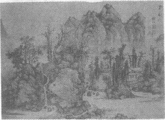 明。谢时臣(见《谢时臣虎阜春晴图轴》条目)绘。纸本水墨。纵55厘米,横72.5厘米。山东省博物馆藏。此图绘溪山秋天的景色及隐居情趣。远处山峦重叠,山势险峻雄伟。远山淡抹,颇有层次。山谷幽美,烟雾弥漫。山前,一泓清泉从山间流淌下来,汇成溪水,似潺潺有声。树木掩映下,有几间茅屋草舍。近景板桥上,有两人正在交谈。有的树叶开始凋谢,但仍然苍郁而不显萧条冷落,给人一幅肃穆深远的感觉。构图巧妙新颖,笔法粗壮浑厚。树石皆蓊郁有致。动中有静,静中有动,动静结合,恰到好处。右上自题:“溪山秋晚。樗仙。”