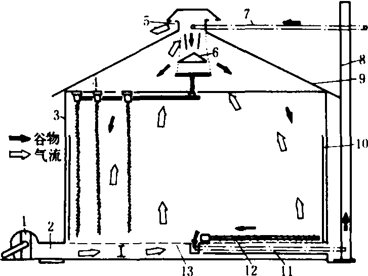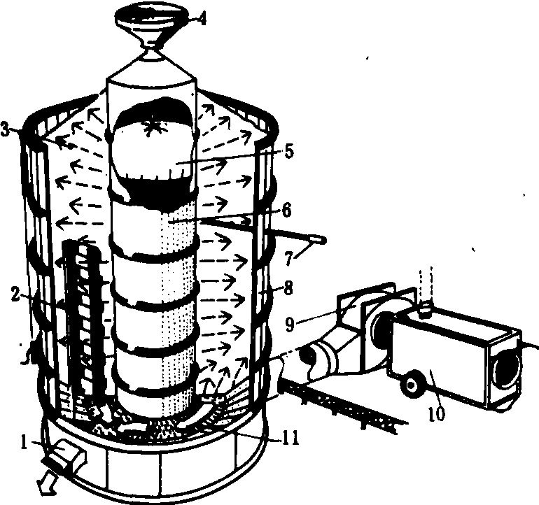图1 圆筒仓干燥机 1.卸粮口; 2.梯状卸粮器; 3.谷物; 4.装粮料斗; 5.限位阀; 6.中央通风管; 7.测温计和取样器; 8.仓壁;9.风机; 10.加热器; 11.带孔底座 谷物干燥贮存仓 干燥和贮存谷物的兼用设备。主要用于玉米、小麦、稻谷的低温加热干燥,也能用作其他农产品的常温通风干燥。它由干燥仓、风机和加热器等组成。按结构型式分为垂直气流通风干燥仓和径向通风干燥仓两种。 垂直气流通风干燥仓由带小孔的透风地板承受谷物,干燥气流由地板下的通风道经过地板小孔向上穿过谷物层,吸收水分后,空气由仓顶排出。径向通风干燥仓由透风圆筒仓壁和中央通风管构成,干燥气流由仓底进风口进入中央通风管,再径向穿过谷层,吸收水分后,从圆筒仓壁排出。由于此谷物干燥仓就是贮存仓,不需倒仓,节省了费用。这种常温通风干燥仓结构简单,使用成本低,对谷物无污染。但干燥速度受空气的湿度影响较大。 移动床谷物干燥机 谷物在干燥过程中处于连续流动状态。它具有进料速度与干燥能力一致的输送和提升装置,连续不断地将湿谷装入,通过干燥后,将干谷卸出。 基本型式 根据干燥气流和谷物在干燥机内相对流动方向,可分为: ❶横流型干燥机。干燥气流垂直于谷物的流动方向通过谷层。这种干燥机靠近气流入口的谷层温度高、干得快、水分低,谷粒的温度很快接近进口气流温度。而在气流出口处的谷层温度较低、干得慢、水分高,所以干燥均匀度差,谷层的厚度不能太大。在干燥过程中或干燥后需将谷物搅拌均匀。横流型谷物干燥机的进气温度一般为80~100℃,风量为0.25~0.4米3/米2·分,谷层厚度一般为0.3~0.46米。横流型也用于连续流动式干燥机的冷却部分。 ❷顺流型干燥机。干燥气流与谷物的流动方向一致。由于进口气流一开始就遇到冷谷物,温度降低很快。因此,采用148~260℃的高温进行干燥尚不致使谷温过高,使开始阶段就有较高的干燥速度。在干燥最后阶段,气流和谷物的温度几乎相等,即最干的谷物温度较低,有利于减少应力裂纹和爆腰现象。顺流型干燥机可以采用较厚的谷层。 ❸逆流型干燥机。干燥气流与谷物的流动方向相反,干燥终了谷物的温度最高,为了不致使谷物过热,气流温度不能太高。当气流流向排气口时,空气已接近饱和状态,由于被刚进入干燥机的冷谷冷却,会产生冷凝现象。因此,谷物在进入干燥机的初始阶段,可能会增加含水率。这种干燥机的干燥效率较高,适合干燥高水分时不能经受高温快速干燥而低水分时耐温性较强的谷物,如小麦和玉米等。 ❹双向气流型干燥机。其干燥热气流在干燥过程中交替换向,从而可提高干燥均匀性和热量的利用率,有横向左右交替和顺流、逆流交替两种类型。 循环式干燥贮存仓 其结构如图2。仓内有谷物循环输送系统、通风系统和搅拌系统。循环系统的扫仓螺旋输送器绕仓的中心线回转,将仓内谷物不断地从地板表面刮扫到卸粮口,再经排粮输送器、斗式升运器、胶带输送器送向分布器,将谷物均匀撒入仓内。 通风系统由风机、风管和多孔地板组成。干燥气流由风机、风管送入仓底,经多孔地板向上穿过谷层。为了进一步降低干燥仓内粮食的水分梯度,有些干燥仓设有1~5个搅拌用垂直螺旋,仓径为4~7米时,配有3个螺旋;12~15米时配5个螺旋。工作时,垂直螺旋一面自转,一面又围绕圆仓中心线公转,同时沿径向臂来回运动。搅拌器的作用是:❶进一步降低仓内谷物的垂直水分梯度,消除仓底谷物的过干层,因而在干燥玉米时可采用较高温度(70℃)的干燥气流,缩短干燥时间; ❷将压实的湿谷区分散开,增加通过谷物的风量,加速去水,提高干燥效率。当谷物的原始含水率为18~20%时,谷层厚度可达4米左右。装有搅拌螺旋的干燥贮存仓干燥效率高,通过深床谷物的热空气,全部达到饱和,不浪费热能。特别适合低温或自然通风,通过干、湿谷层的混合,还可以延长贮存期限。